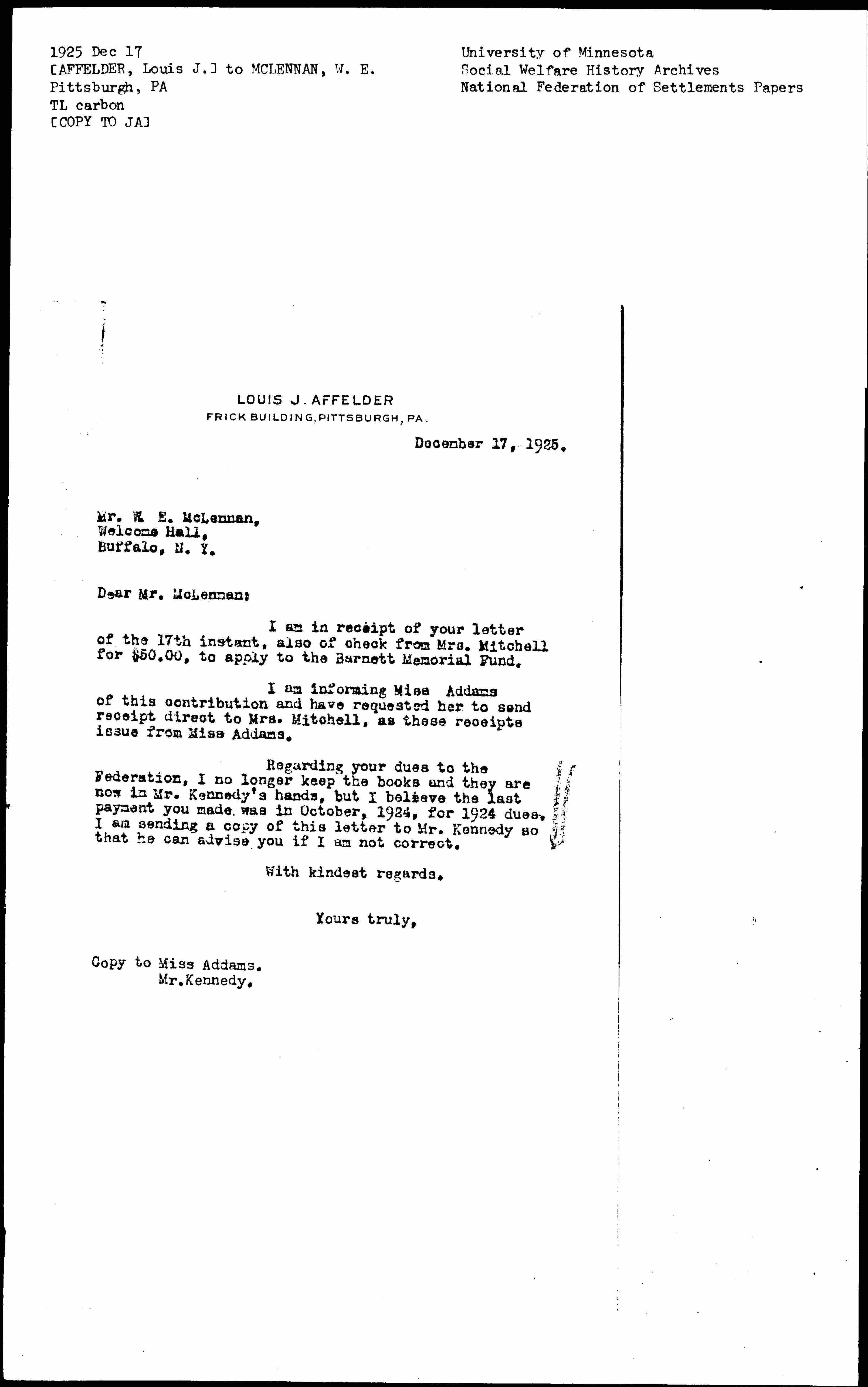 I am informing Miss Addams of this contribution and have requested her to send receipt direct to Mrs. Mitchell, as these receipts issue from Miss Addams.