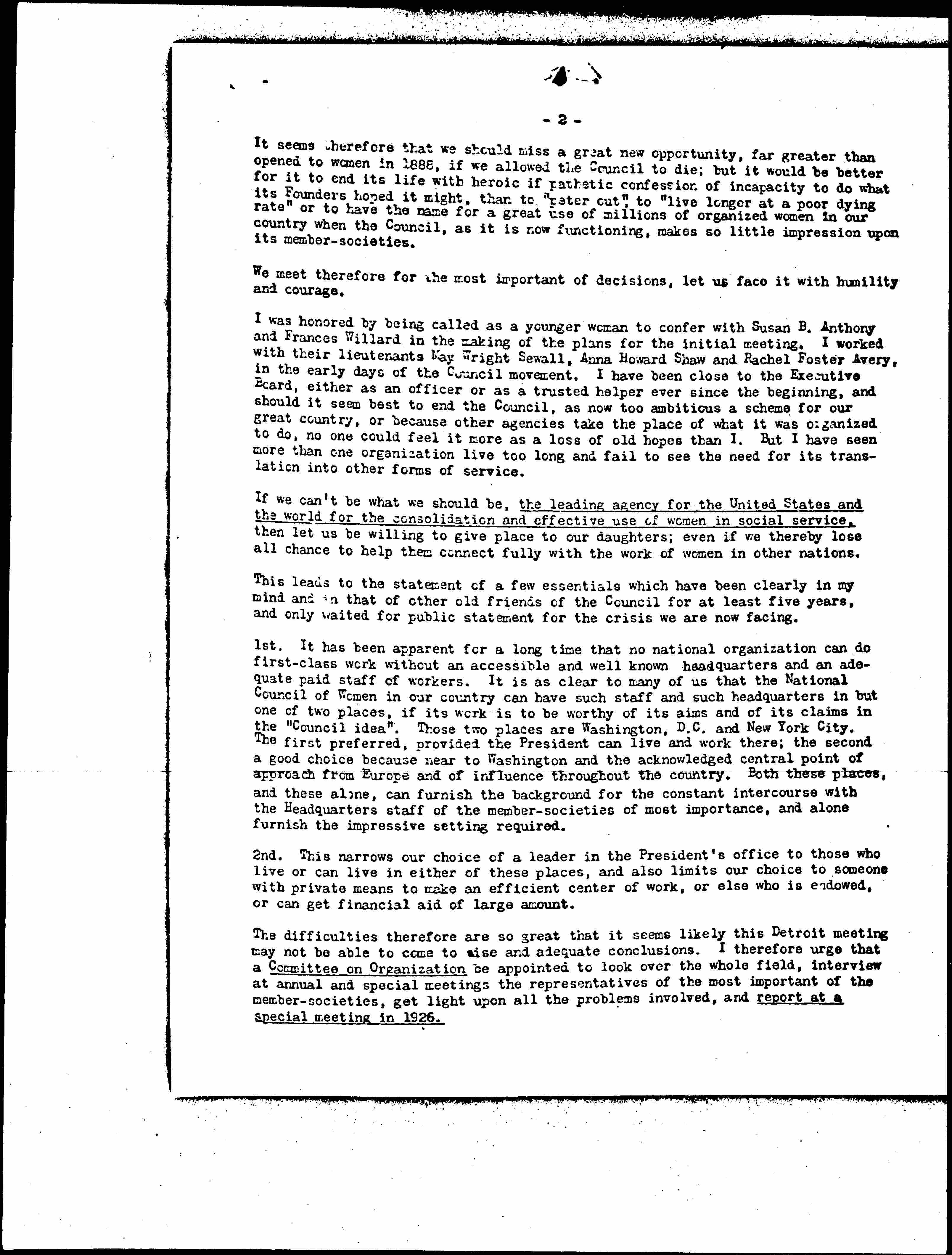 One reason why it would seem best to preserve the Council and to reorganize and make stronger its life and work, is that only through the Council of the United States, as at present organized by its membership of National Societies, can the women of America keep step with the women of other lands. The Constitution of the International Council, rigidly obeyed by the Councils of the Old World, determines that only through the required form of National Association of National Societies shall we have representation in its deliberations and activities. If we gave up our Council we should give up all hope for American women to get a place in the many-sided [organized] work of the women of the World. We should, also, by the same token lose the chance to stand with the women of other countries at the [doorways] of the great Commissions of the League of Nations which deal with the protection of women and children, with the help toward the abolition of traffic in dangerous drugs, and with the many-sided educational propaganda and work of those Commissions; for it is in and through the International Council of Women and its child, the "Save the Children" movement, and its twin effort in the educational fields, that we get out best chance to help at Geneva. [page 2]