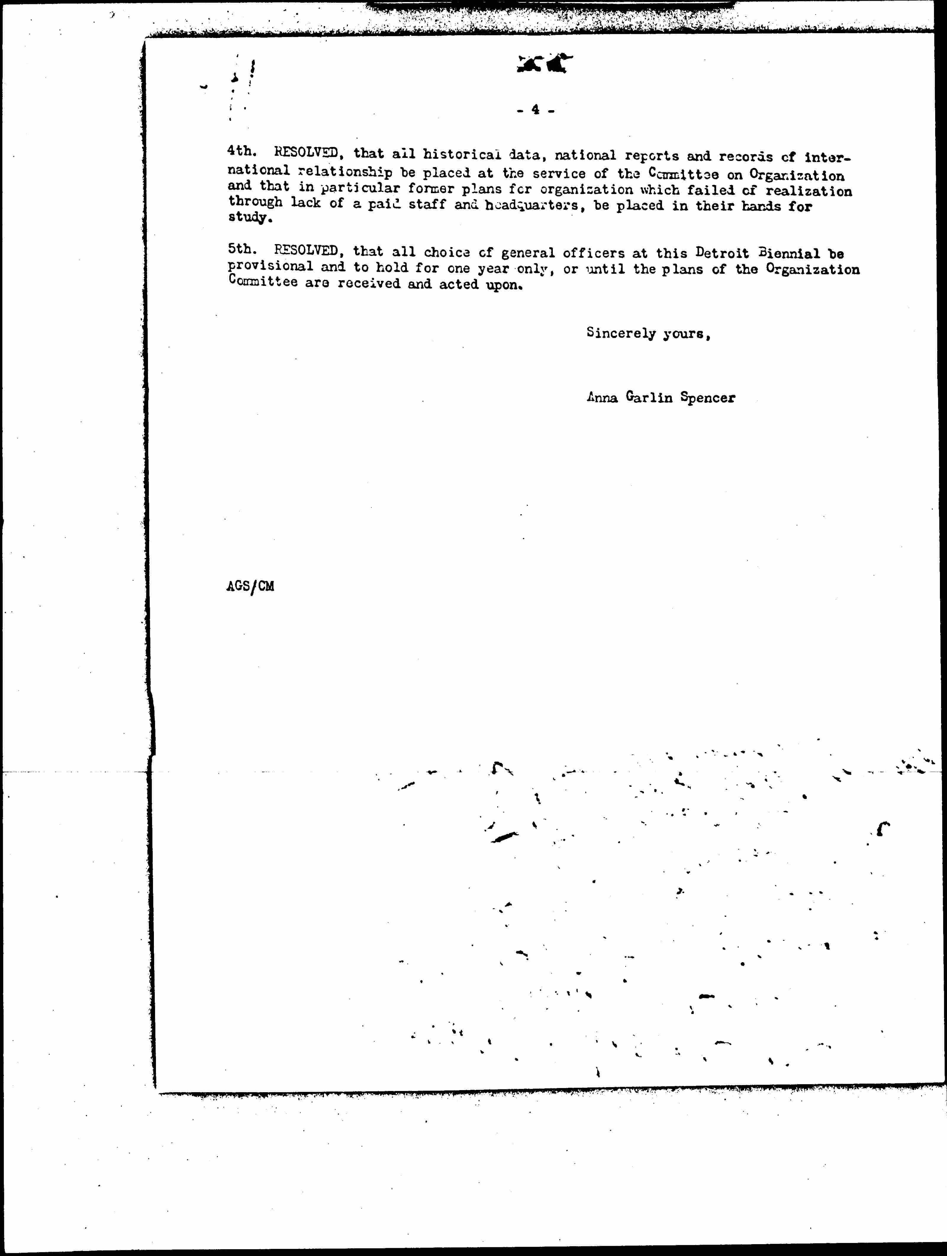 4th. RESOLVED, that all historical data, national reports and records of international relationships be placed at the service of the Committee of Organization and that in particular former plans for organization which failed of realization through lack of a paid staff and headquarters, be placed in their hands for study.