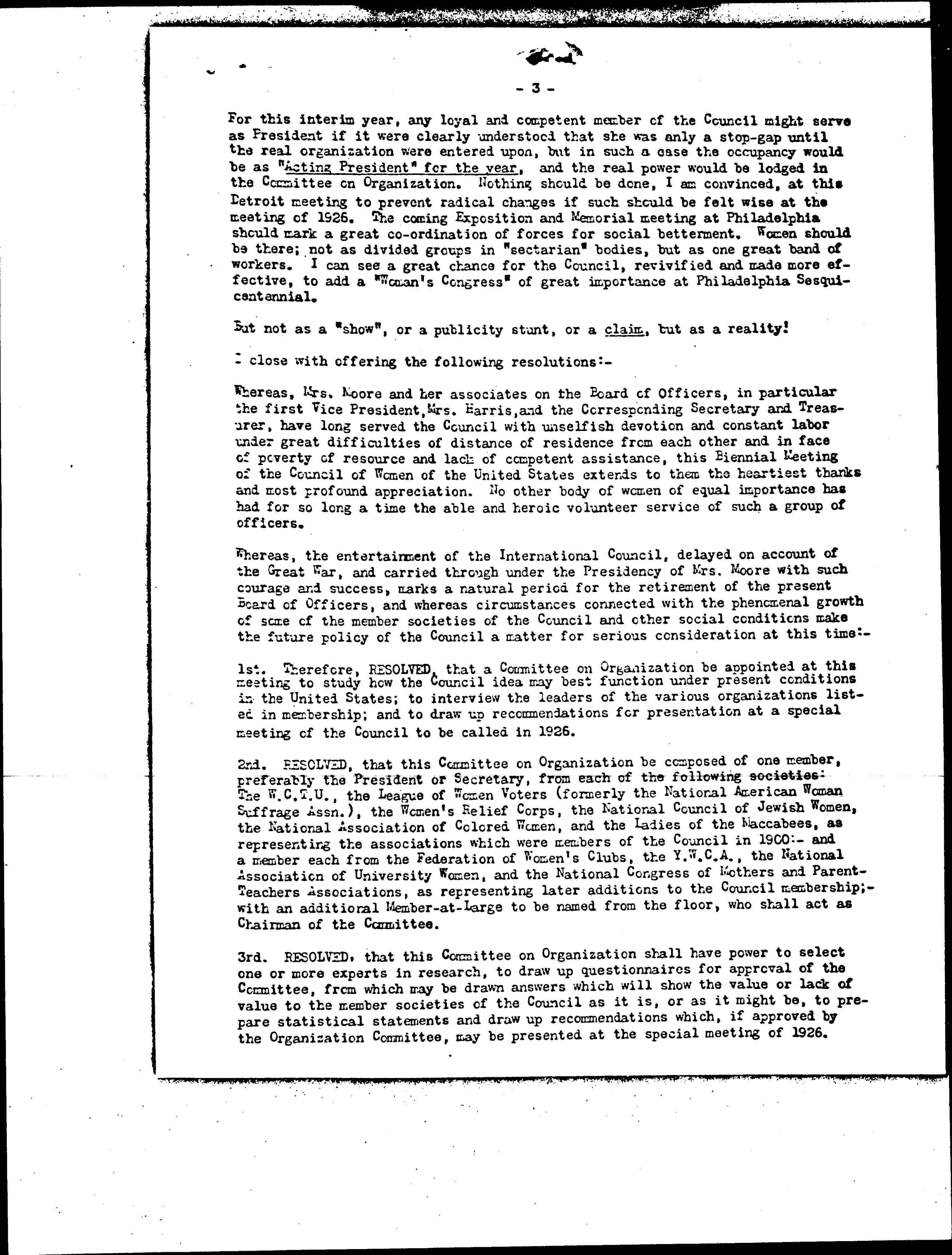 For this interim year, any loyal and competent member of the Council might serve as President if it were clearly understood that she was only a stop-gap until the real organization were entered upon, but in such a case the occupancy would be as "Acting President" for the year, and the real power would be lodged in the Committee on Organization. Nothing should be done, I am convinced, at this Detroit meeting to prevent radical changes if such should be felt wise at the meeting of 1926. The coming Exposition and Memorial meeting at Philadephia be there; not as divided groups in "sectarian" bodies, but as one great band of workers. I can see a great chance for the Council, revivified and made more effective, to add a "Woman's Congress" of great importance at Philadelphia Sesquicentennial.