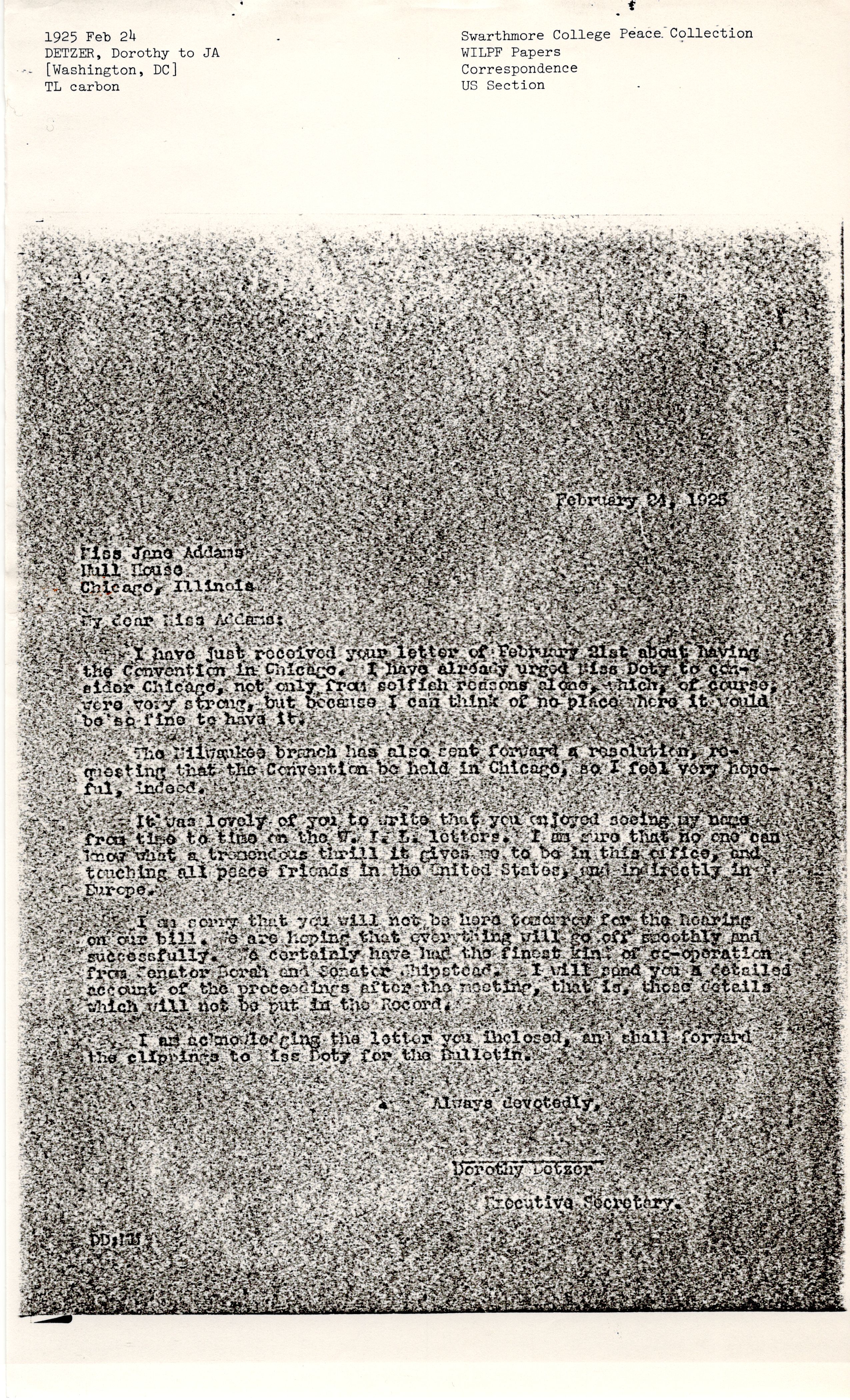 I have just received your letter of February 21st about having the Convention in Chicago. I have already urged Miss Doty to consider Chicago, not only from selfish reasons alone, which, of course, were very strong, but because I can think of no place here it would be so fine to have it.