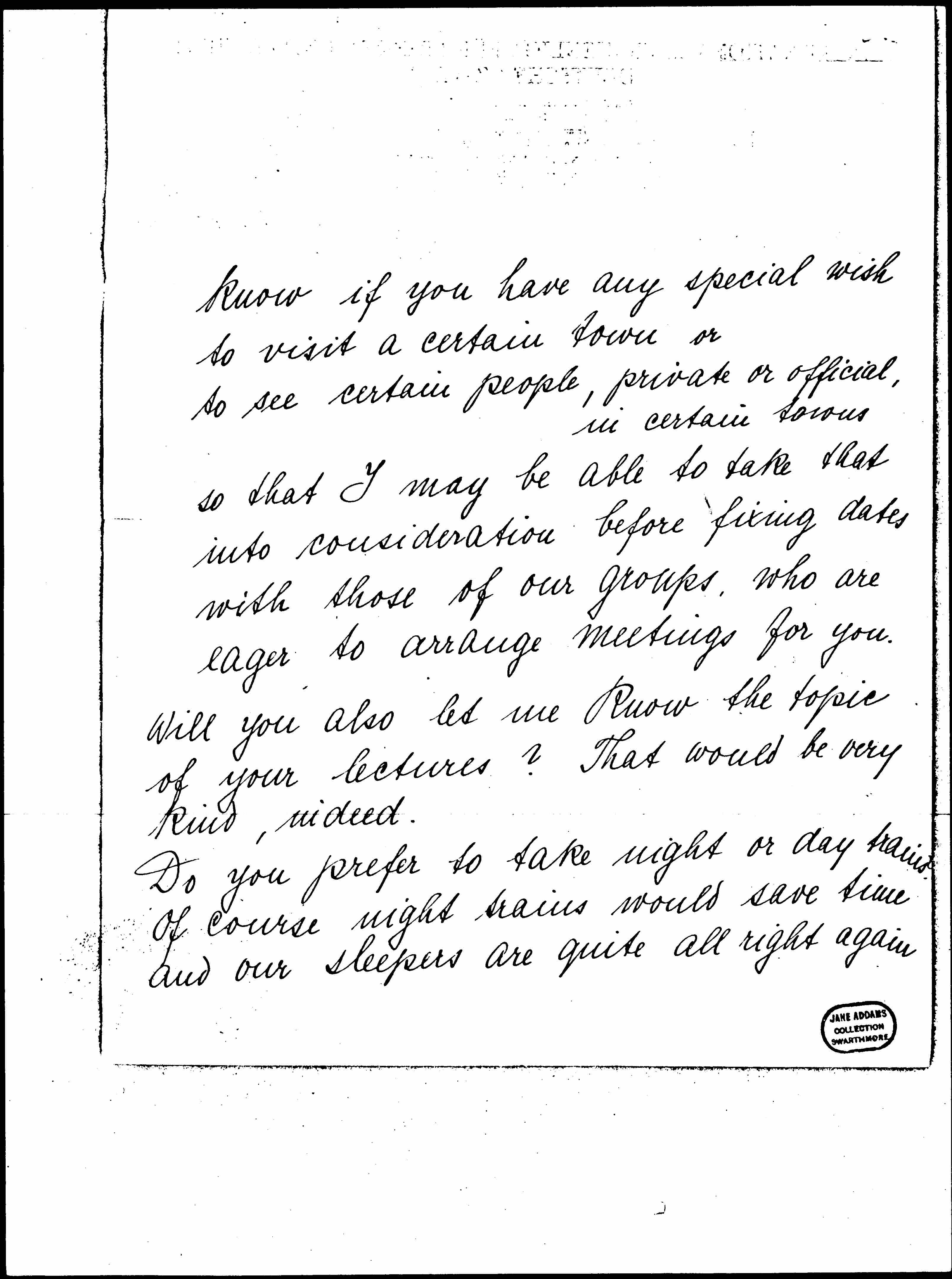 Will you also let me know the topic of your lectures? That would be very kind, indeed.Do you prefer to take night or day trains? Of course night trains would save time and our sleepers are quite all right again. [page 3] But I do not want to do anything that would not be comfortable to you. Therefore I wait with the final arrangements until I have got your answer to the questions above.