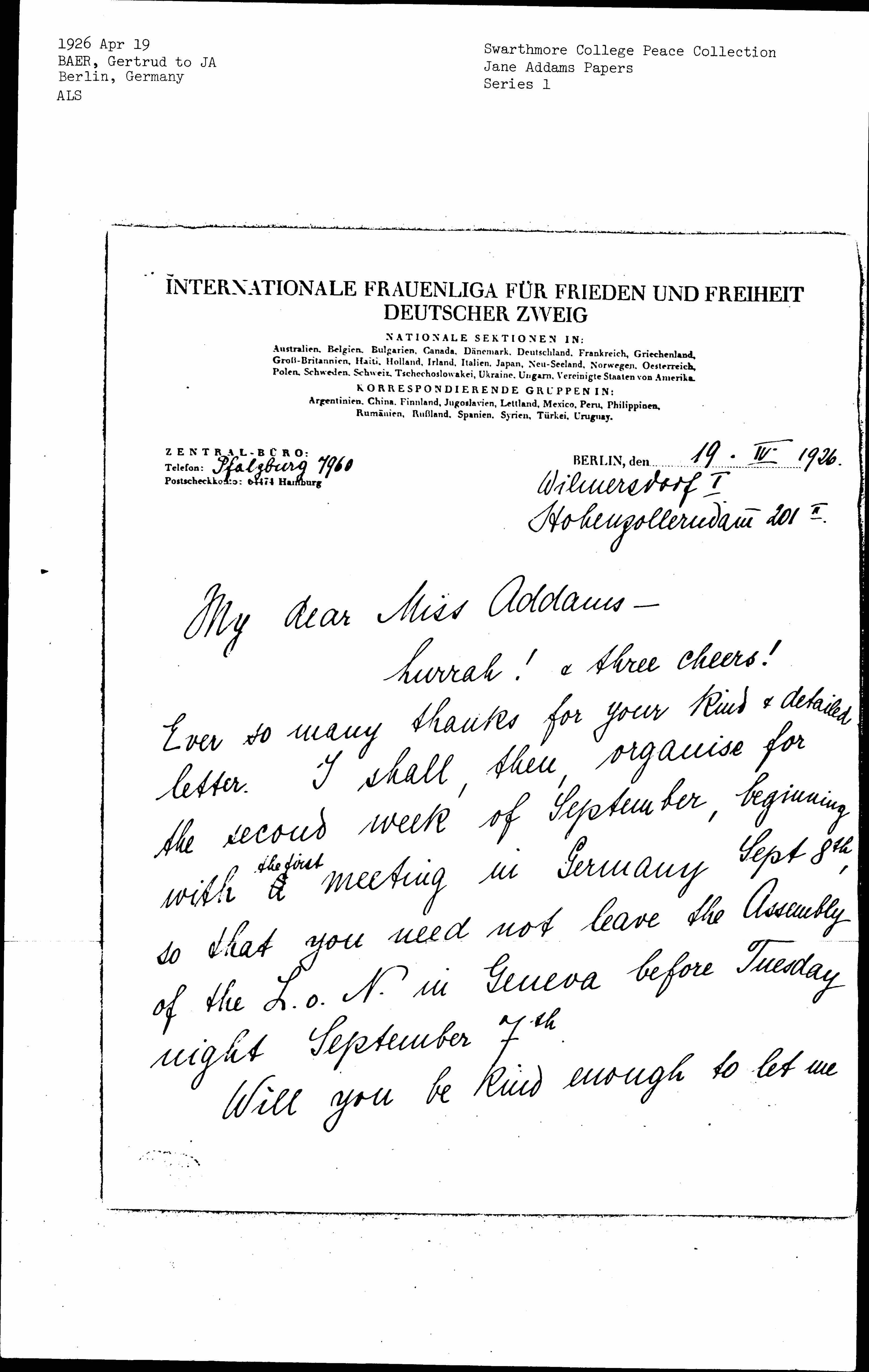 Ever so many thanks for your kind & detailed letter. I shall, then, [organize] for the second week of September, beginning with a ↑the first↓ meeting in Germany Sept 8th, so that you need not leave the Assembly of the L.o.N. in Geneva before Tuesday night September 7th.