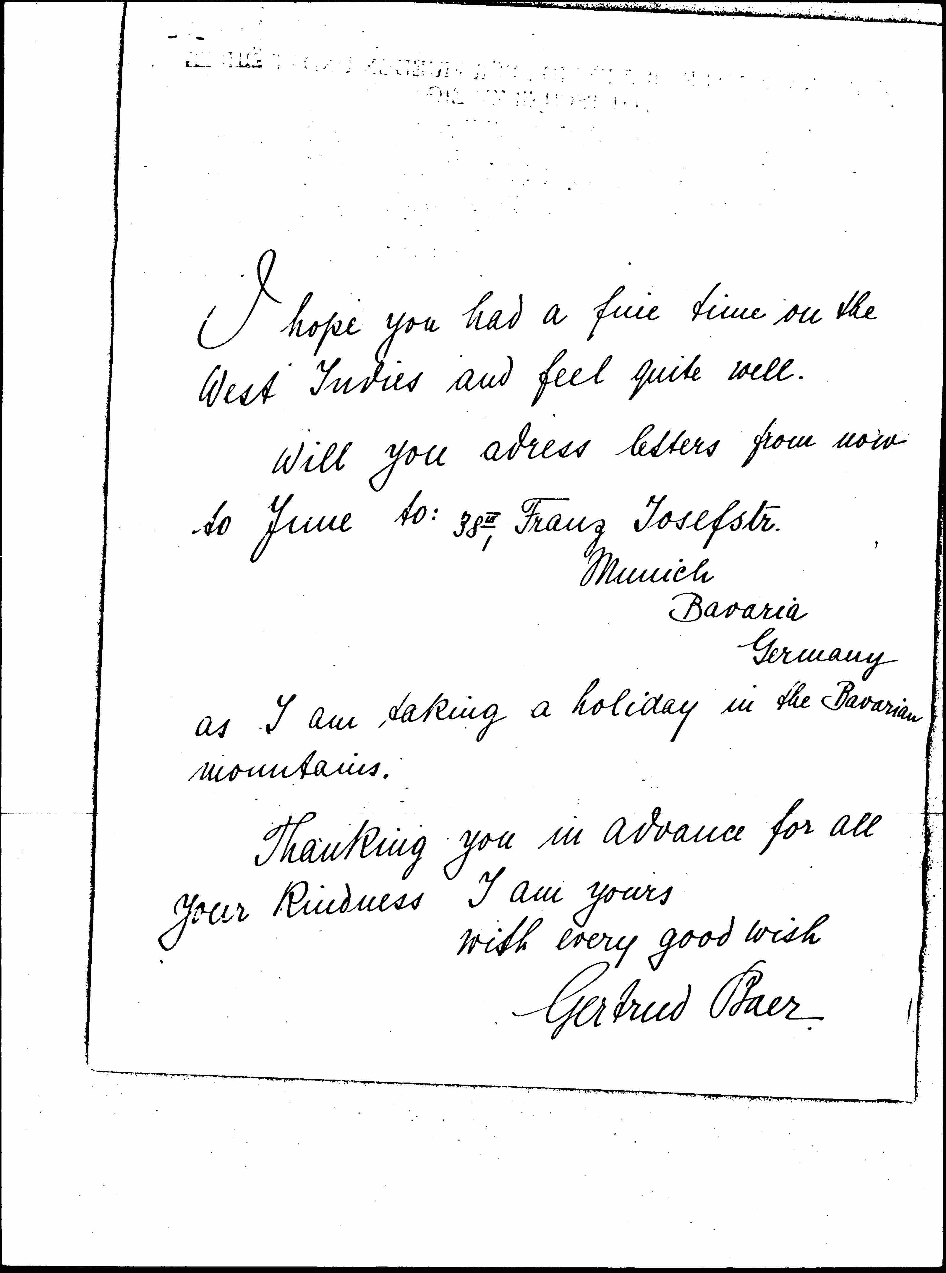 Will you [address] letters from now to June to: 38 III, Franz Josefstr. Munich Bavaria Germany