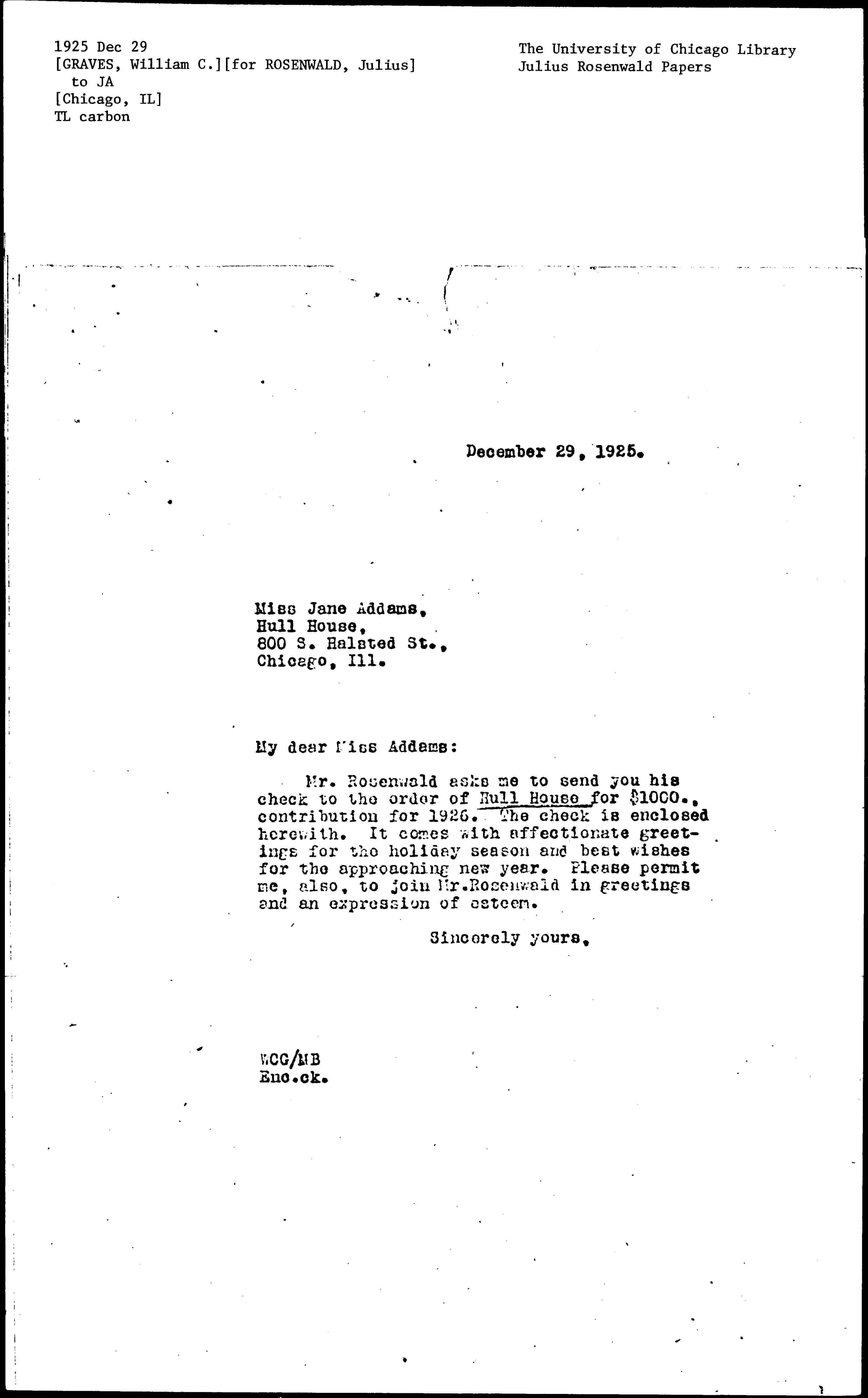 Mr. Rosenwald asks me to send you his check to the order of Hull House for $1000, contribution for 1926. The check is enclosed herewith. It comes with affectionate greetings for the holiday season and best wishes for the approaching new year. Please permit me, also, to join Mr. Rosenwald in greetings and an expression of esteem.