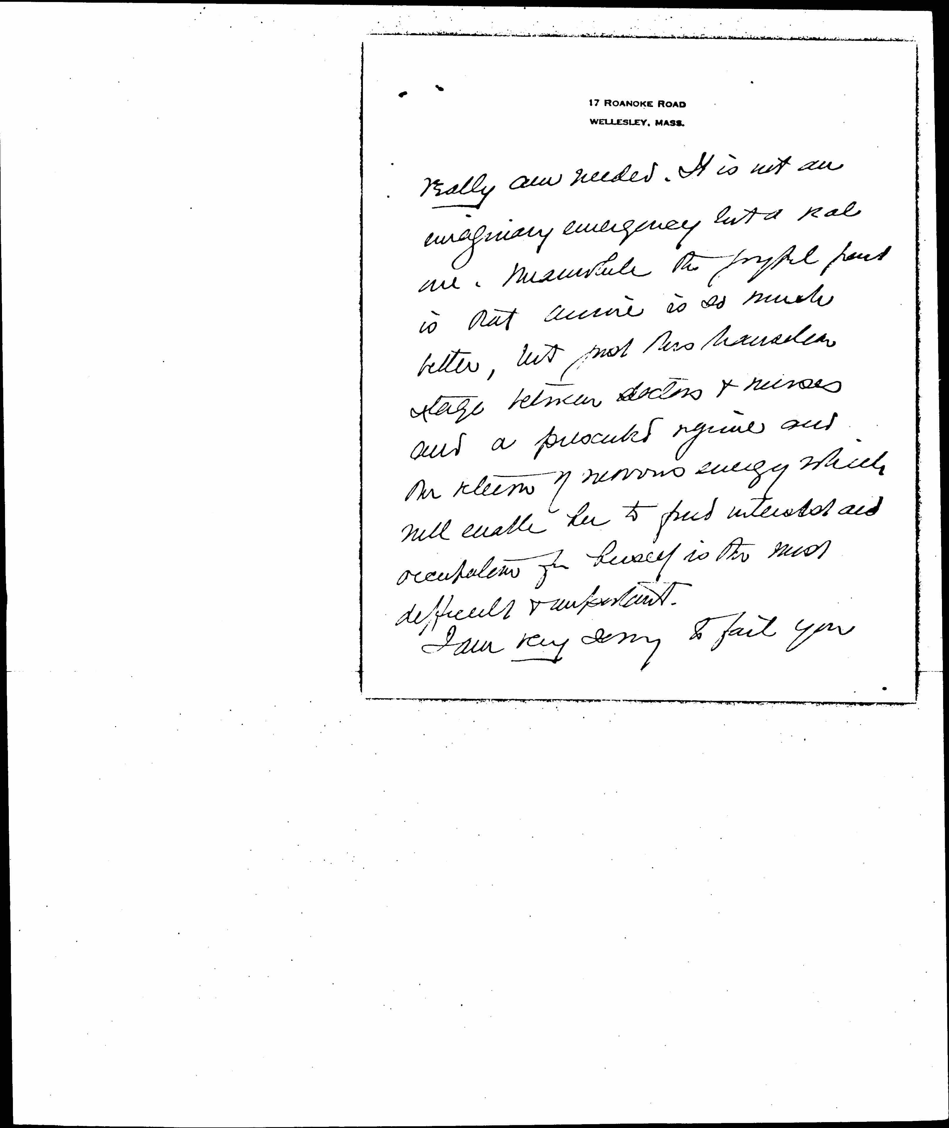 This is not because of my health or anything but the fact that Annie will need constant companionship and. This summer and that I must be on hand. We shall divide among ourselves but I [page 3] really am needed. It is not an imaginary emergency but a real one. Meanwhile the joyful part is that Annie is so much better, but just this transition stage between doctors & nurses and a prescribed regime and the return of nervous energy which will enable her to find interest and occupation for herself is the most difficult & important.