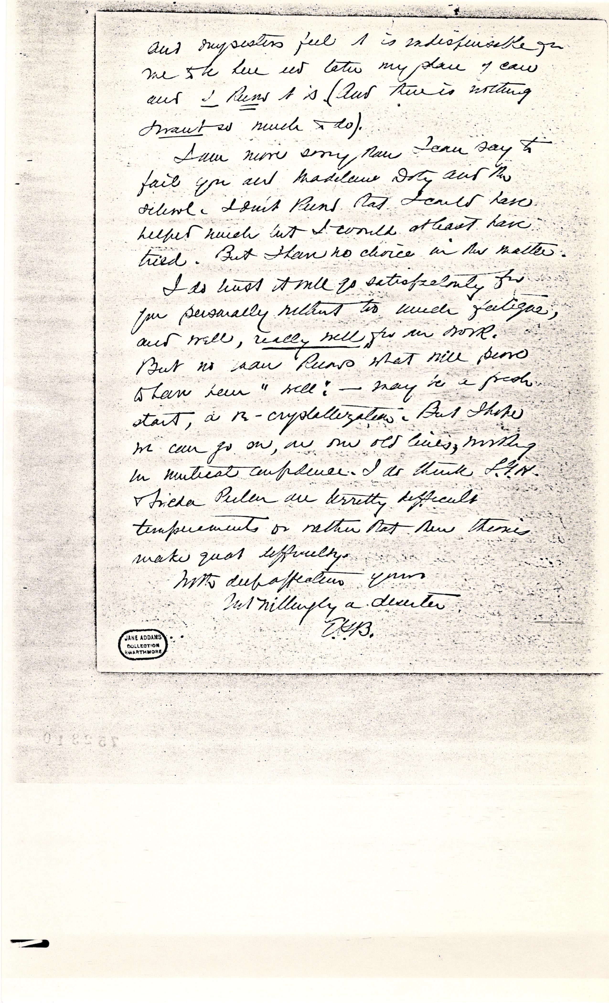 I do trust it will go satisfactorily for you personally without too much fatigue, and well,really well, for our work. But no man knows what will prove to have been "well," -- maybe a fresh start, a [recrystallization]. But I hope we can go on, on our old lines, working in mutual confidence. I do think L. G. H. & Frieda Perlen are terribly difficult temperaments or rather that their theories make great difficulties.