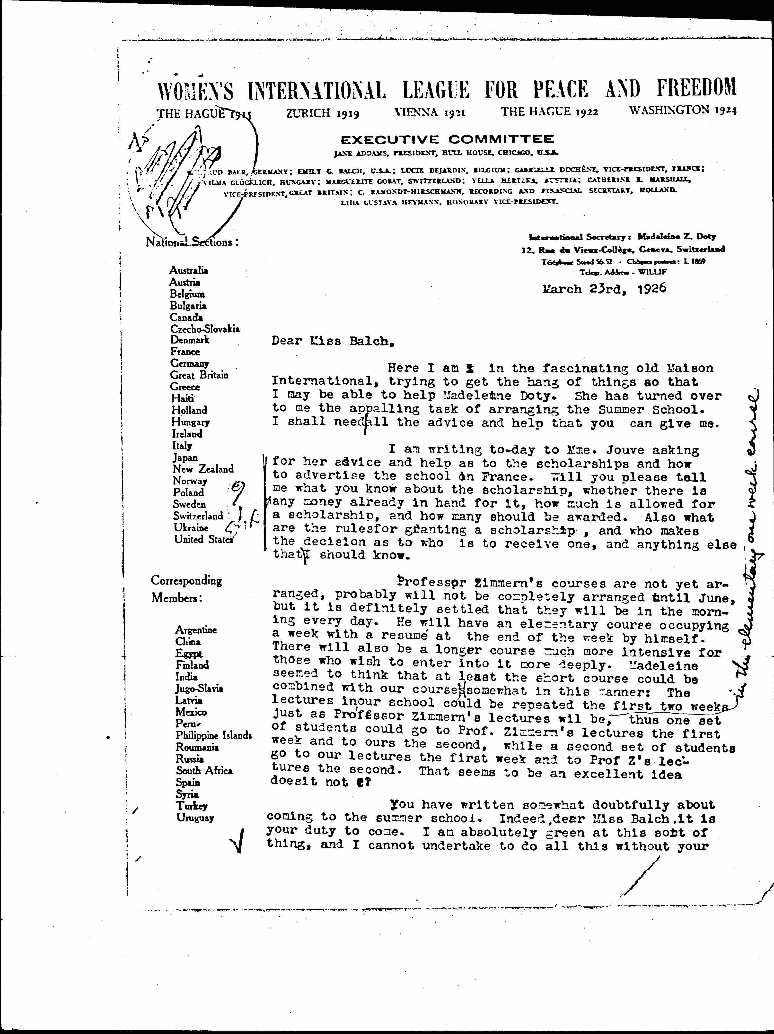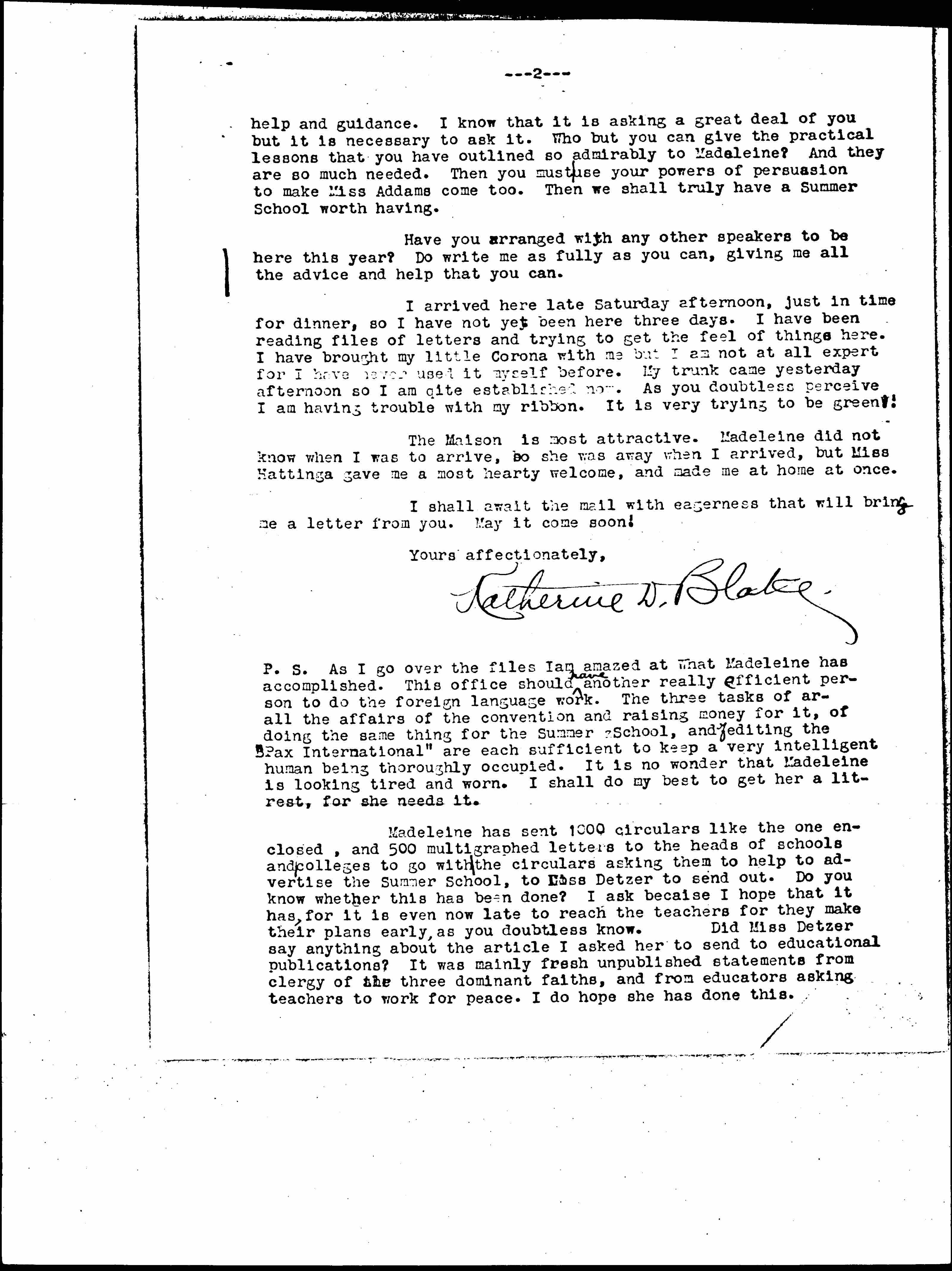 P.S. As I go over the files I am amazed at what Madeleine has accomplished. This office should ↑have↓ another really efficient person to do the foreign language work. The three tasks of all the affairs of the convention and raising money for it, of doing the same thing for the Summer School, and ↑of↓ editing the "Pax International" are each sufficient to keep a very intelligent human being thoroughly occupied. It is no wonder that Madeleine is looking tired and worn. I shall do my best to get her a [little?] rest, for she needs it.
