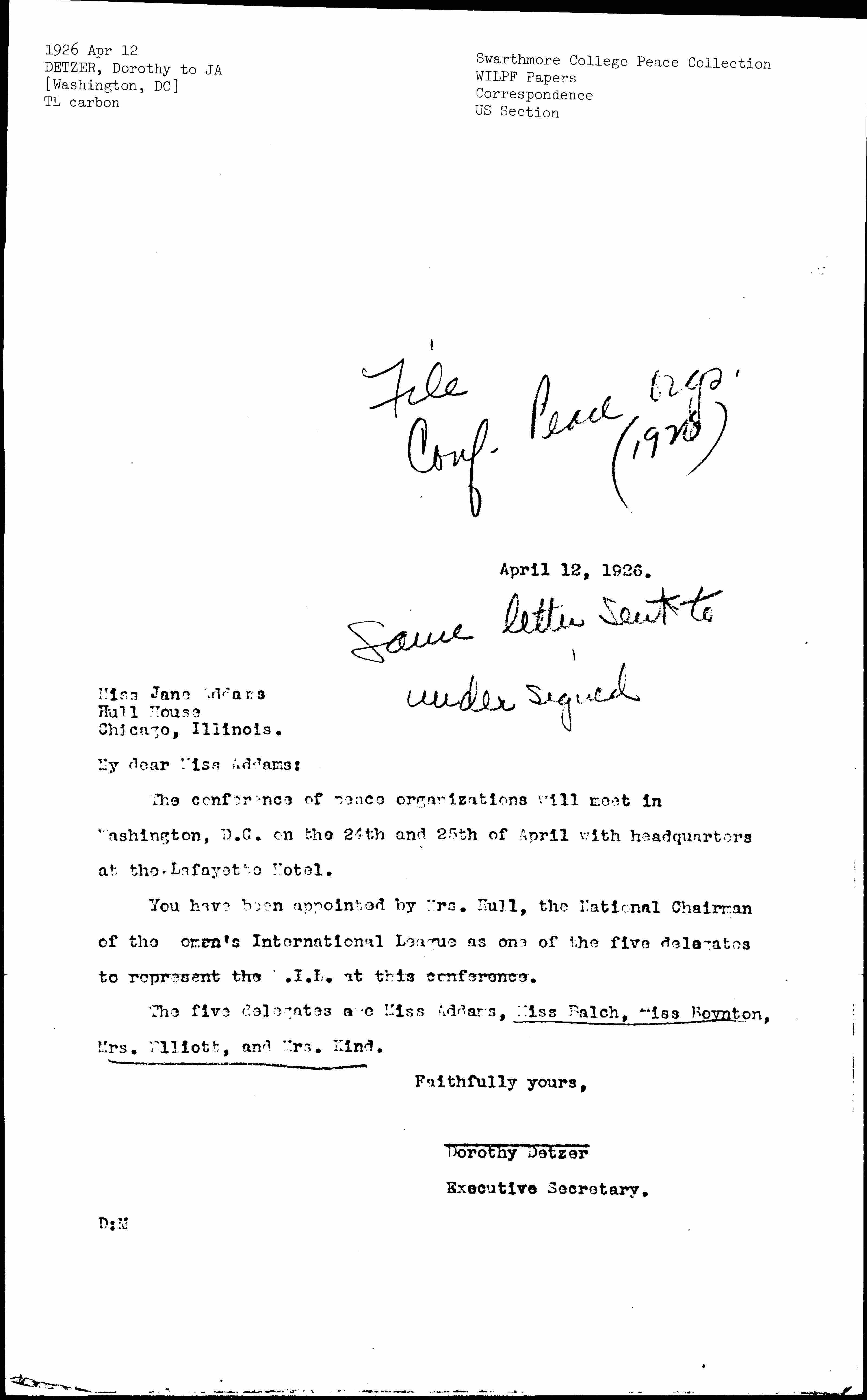 You have been appointed by Mrs. Hull, the National Chairman of the Women's International League as one of the five delegates to represent the W.I.L. at this conference.