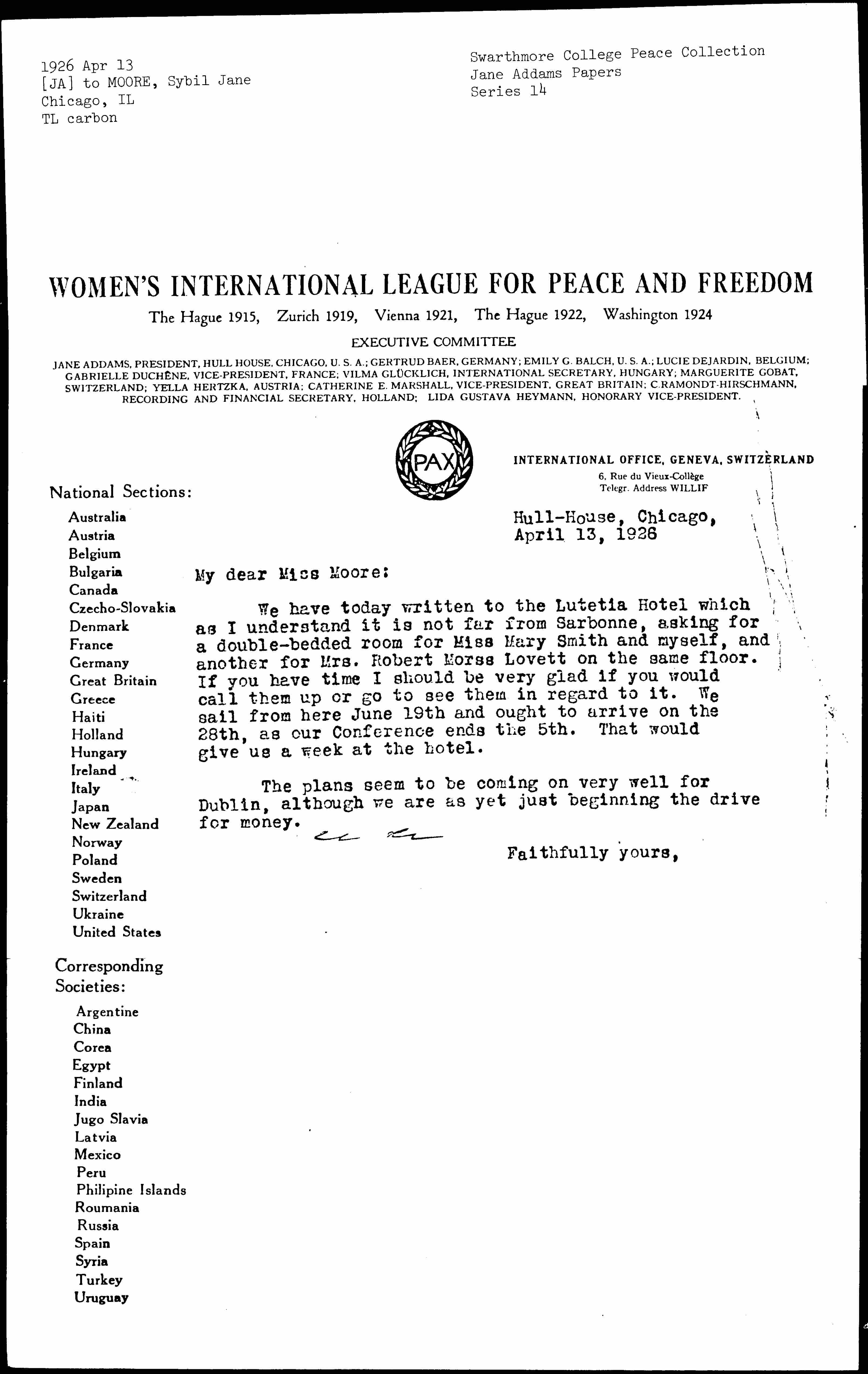 We have today written to the Lutetia Hotel which as I understand it is not far from [Sorbonne], asking for a double-bedded room for Miss Mary Smith and myself, and another for Mrs. Robert Morss Lovett on the same floor. If you have time I should be very glad if you would call them up or go to see them in regard to it. We sail from here June 19th and ought to arrive on the 28th, as our Conference ends the 5th. That would give us a week at the hotel.