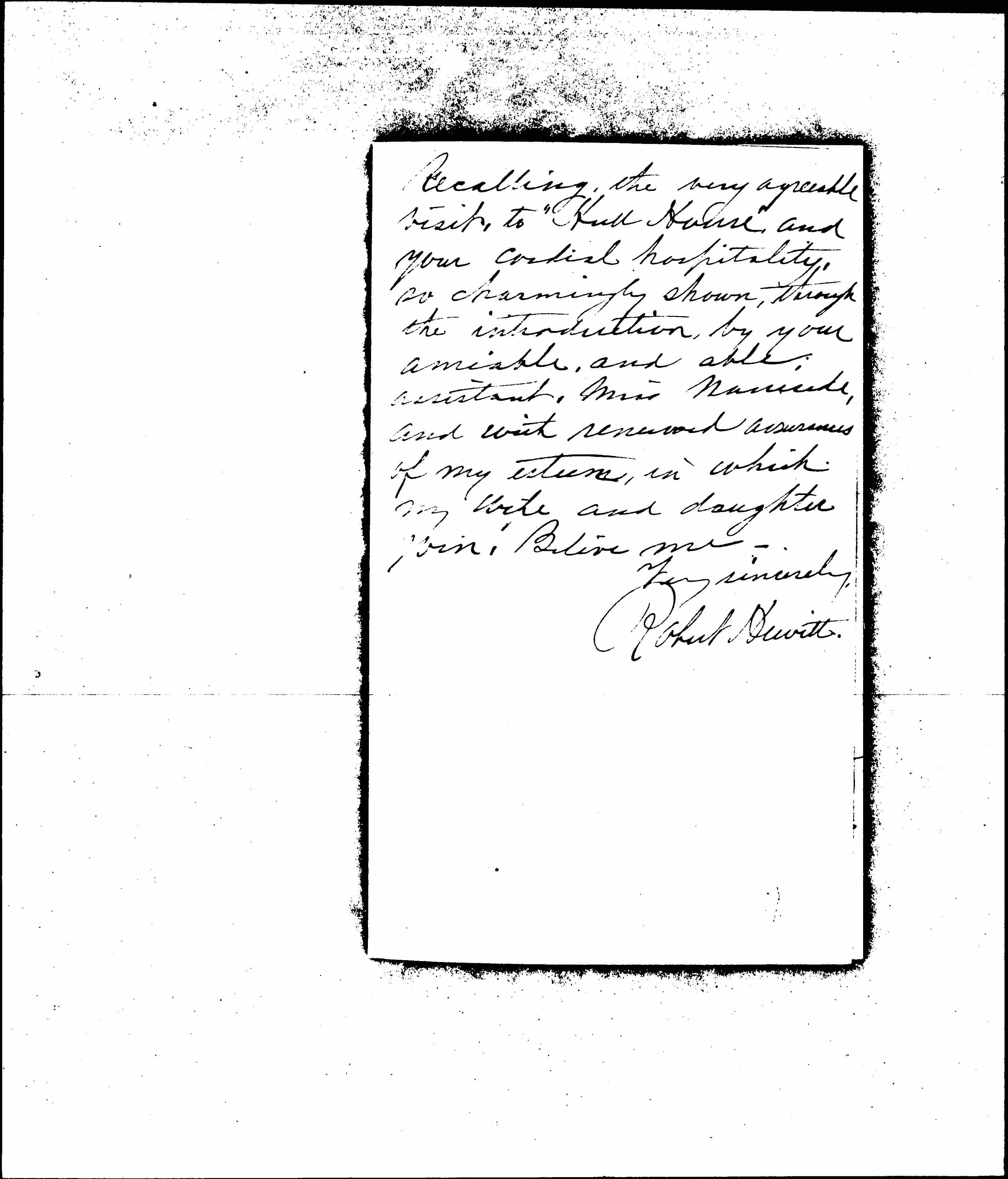 I have read your able article in McClures, and am impressed, with your courage, and the fact that like Lincoln, you fearlessly <attack> a Slavery that can only be uprooted by just such utterances, and fearlessness, as shown by your graphic pen. I will take pleasure, in my small circle, in calling attention to the paper believing that good will come from it wherever discussed. [page 2] Recalling the very agreeable visit, to "Hull House" and your cordial hospitality, so charmingly shown, through the introduction, by your amiable, and able, assistant. Miss Nancrede, and with renewed assurances of my esteem, in which my wife and daughter join. Believe me.