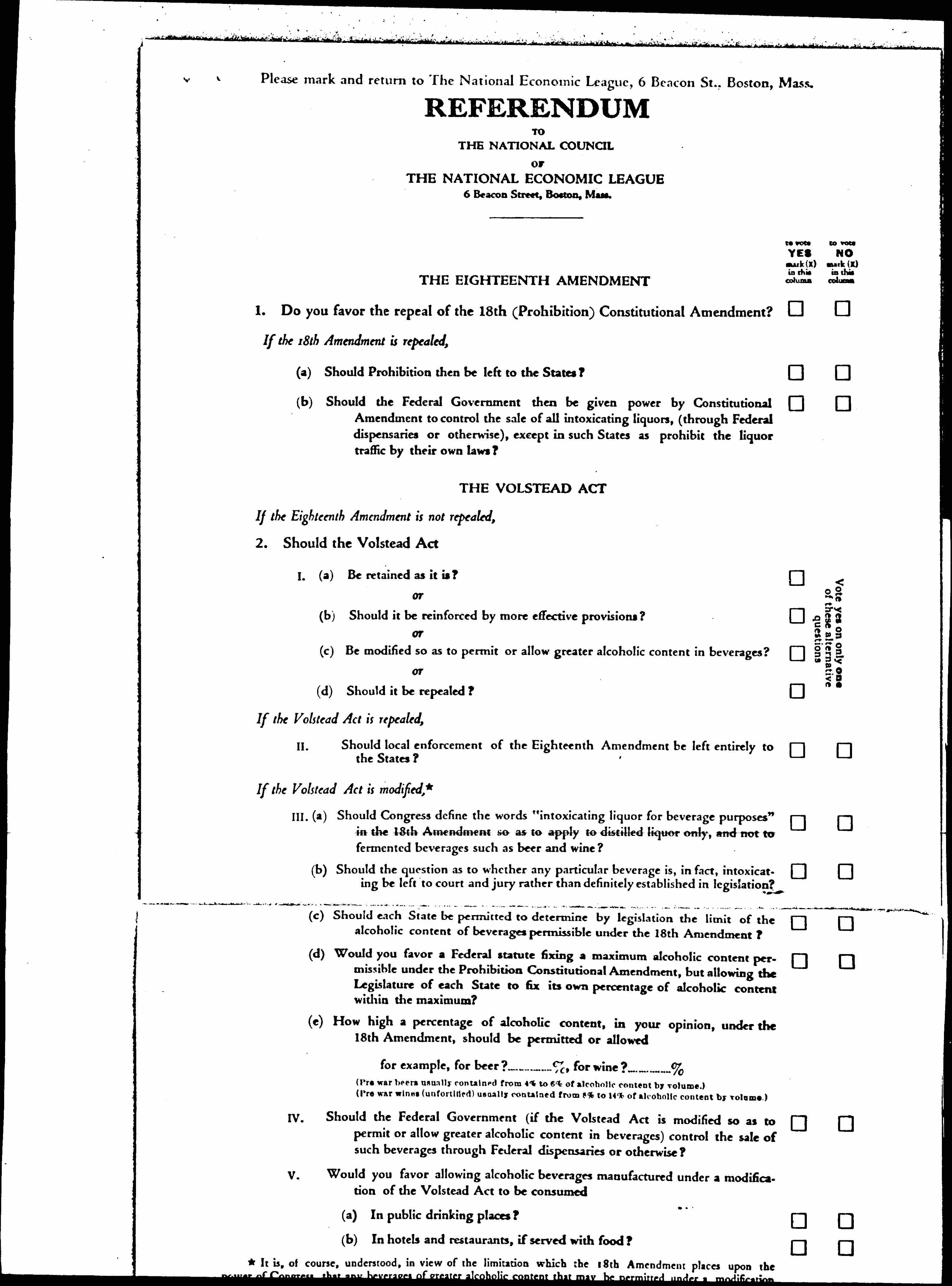 | b) Should the Federal Government then be given power by Constitutional Amendment to control the sale of all intoxicating liquors, (through Federal dispensaries or otherwise), except in such States as prohibit the liquor traffic by their own laws? | ||