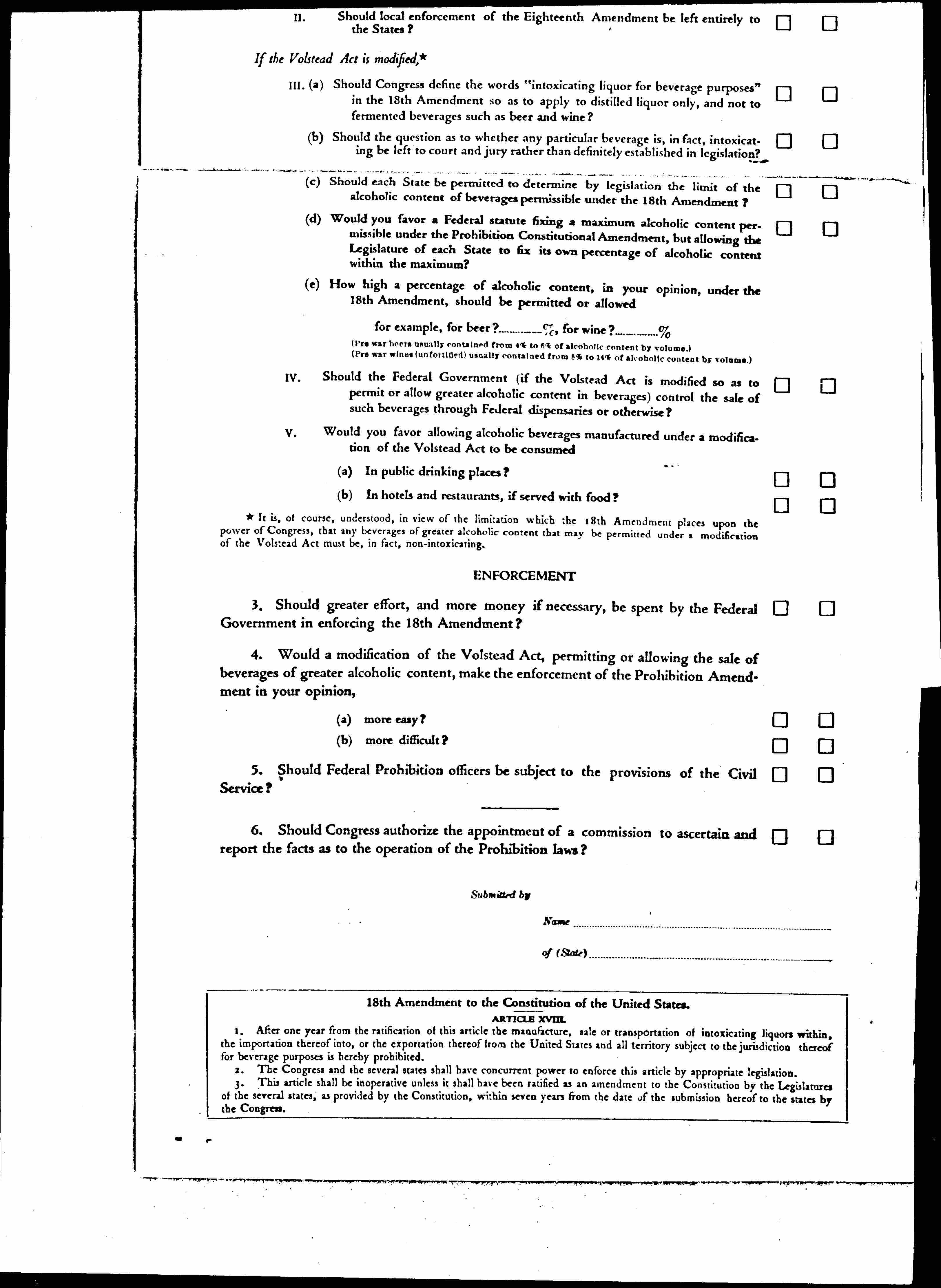 | III. (a) Should Congress define the words "intoxicating liquor for beverage purposes" in the 18th Amendment so as to apply to distilled liquor only, and not to fermented beverages such as beer and wine? | ||