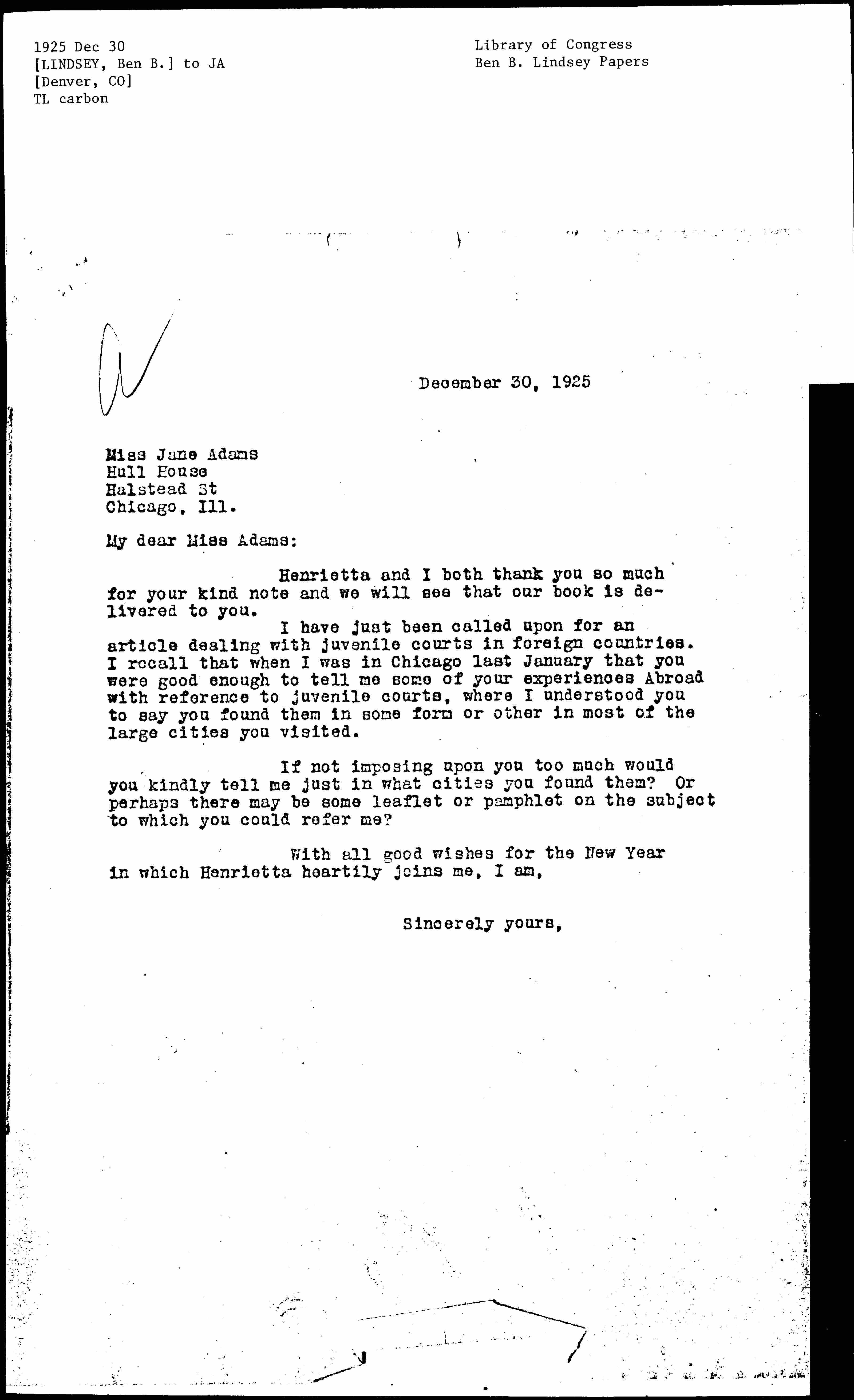 My dear Miss [Addams]: