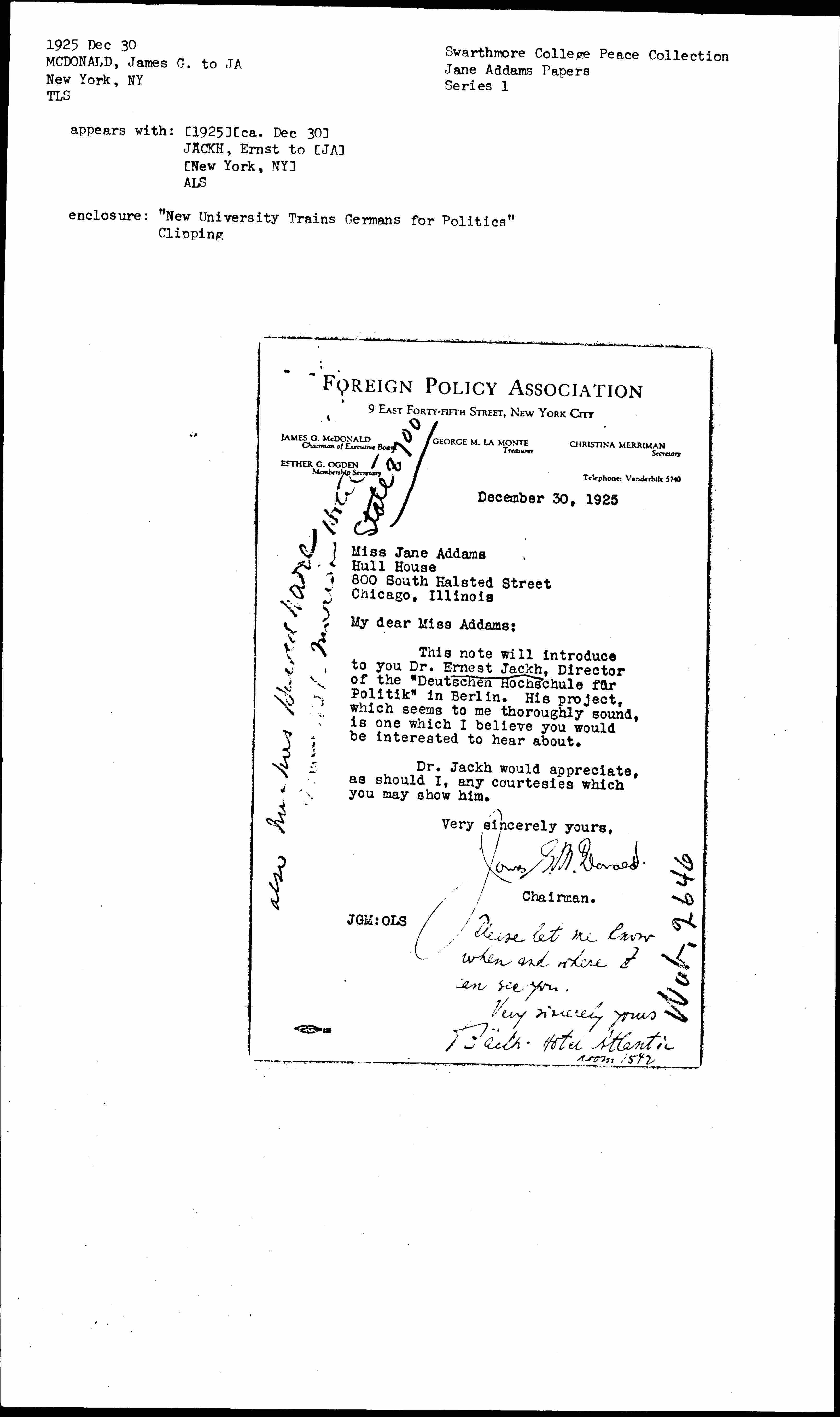 This note will introduce to you Dr. Ernest Jäckh, Director of the "Deutschen Hochschule für Politik" in Berlin. His project, which seems to me thoroughly sound, is one which I believe you would be interested to hear about.