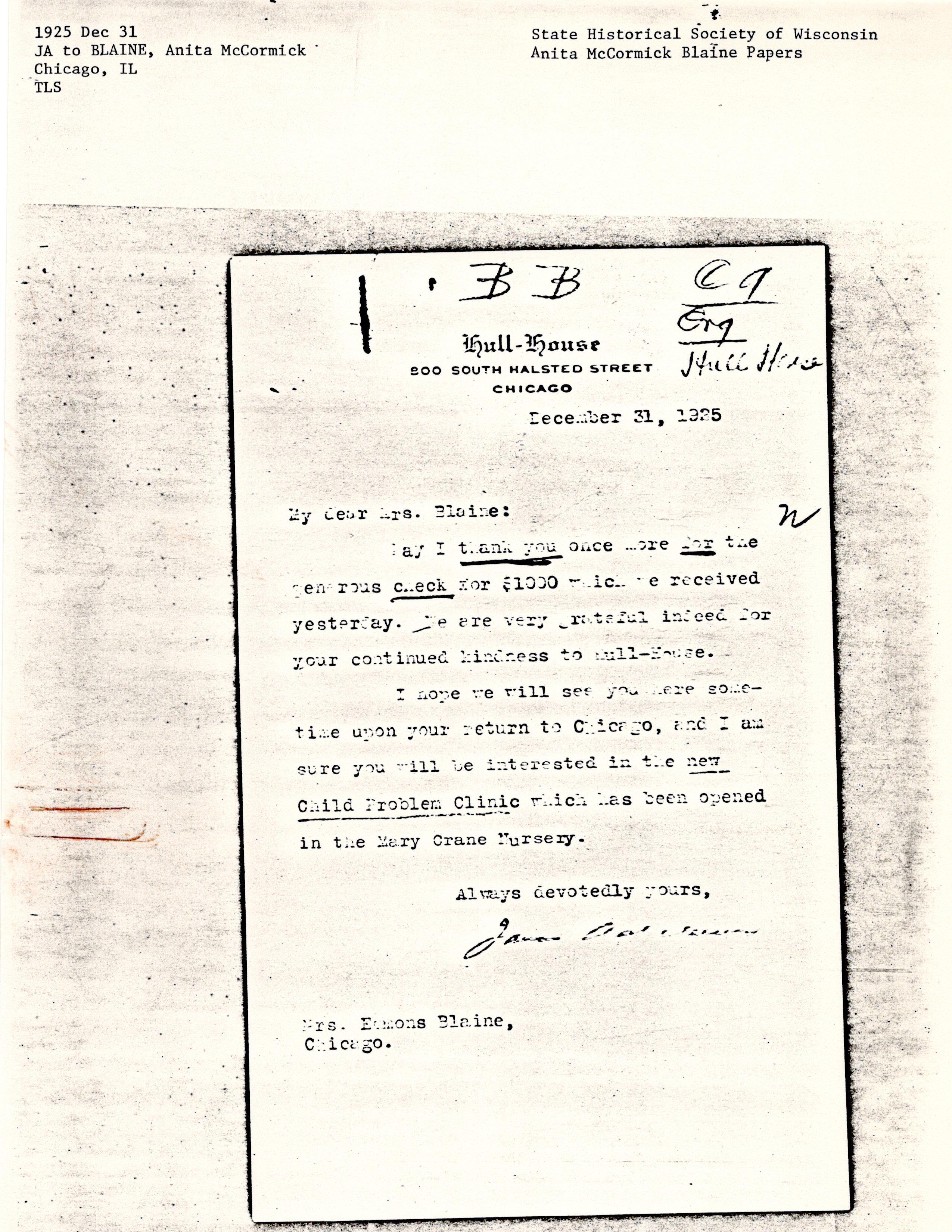 May I thank you once more for the generous check for $1000 which we received yesterday. We are very grateful indeed for your continued kindness to Hull-House.