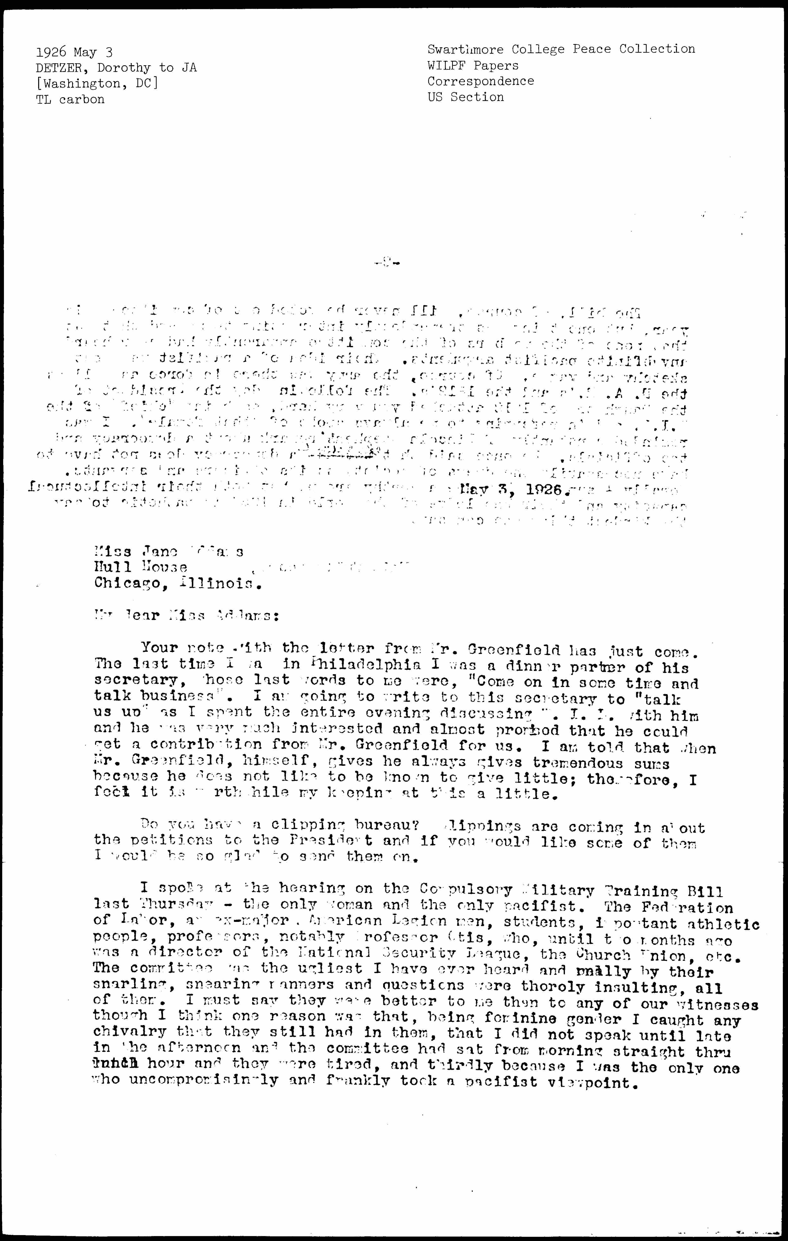 I spoke at the hearing on the Compulsory Military Training Bill last Thursday -- the only woman and the only pacifist. The Federation of Labor, an ex-major, American Legion men, students, important athletic people, professors, notably Professor Otis, who, until two months ago was a director of the National Security League, the Church Union, etc. The committee was the ugliest I have ever heard and [really] by their snarling, [sneering] manners and questions were [thoroughly] insulting, all of them. I must say they were better to me than to any of our witnesses though I think one reason was that, being feminine gender I caught any chivalry that they still had in them, that I did not speak until late in the afternoon and the committee had sat from morning straight [through] lunch hour and they were tired, and thirdly because I was the only one who uncompromisingly and frankly took a pacifist viewpoint. [page 2]