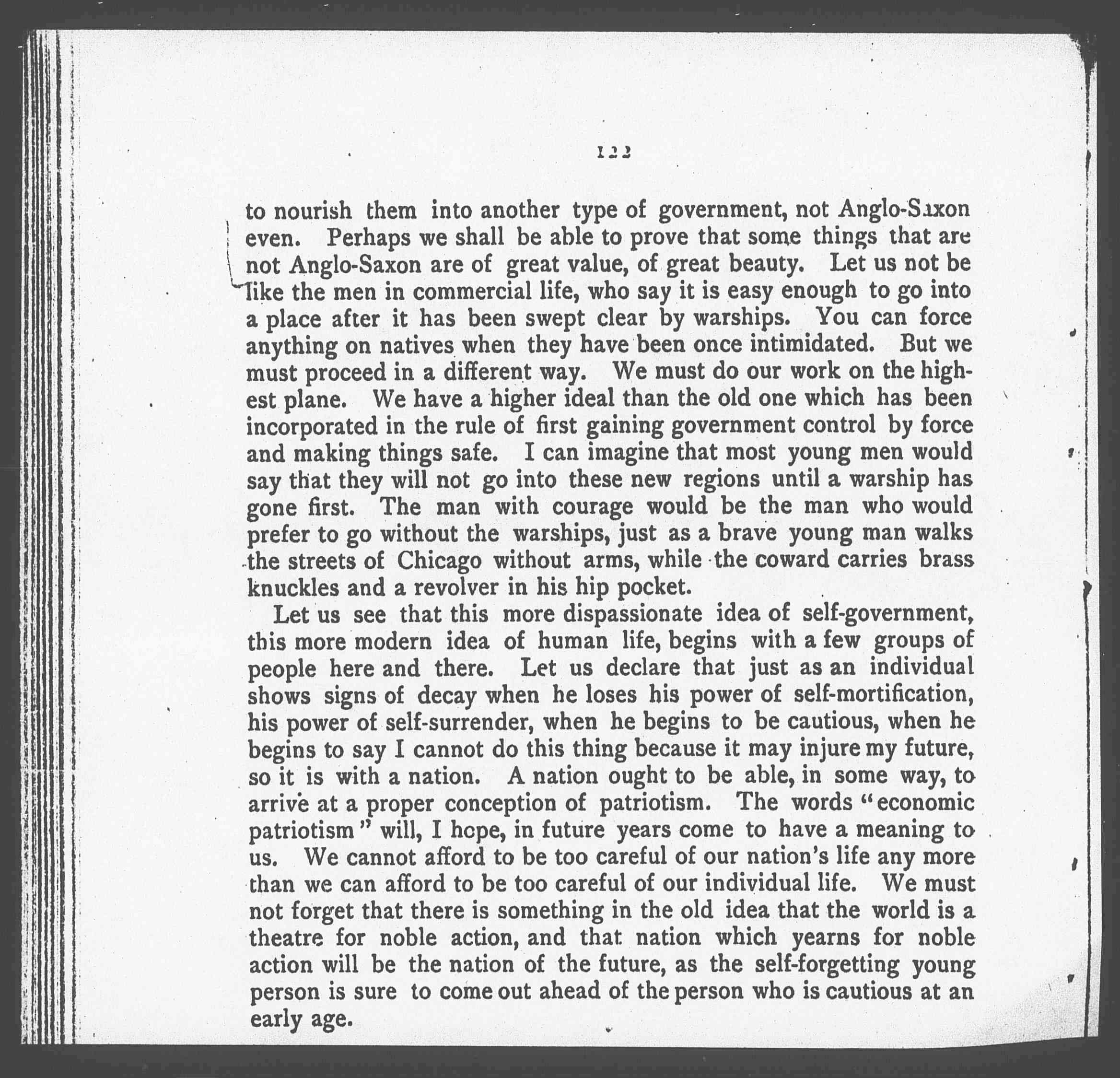 But if we have the spirit of moral adventure, if we believe, as we pretend to believe in America, in democracy, then we shall be ready to take another course, even if it be much more difficult. I do not believe people can say that we no longer believe in democracy in America, but they can say that we no longer trust democracy. Almost every state in Europe has established forts in Africa or Asia or some other place. It seems to me that here in America is the place for experiment. Let us say, "We will trust the people although they are of a different color, although they are of a different tradition from ours. Perhaps we shall be able, through our very confidence, [page 3] to nourish them into another type of government, not Anglo-Saxon even. Perhaps we shall be able to prove that some things that are not Anglo-Saxon are of great value, of great beauty. Let us not be like the men in commercial life, who say it is easy enough to go into a place after it has been swept clear by warships. You can force anything on natives when they have been once intimidated. But we must proceed in a different way. We must do our work on the highest plane. We have a higher ideal than the old one which has been incorporated in the rule of first gaining government control by force and making things safe. I can imagine that most young men would say that they will not go into these new regions until a warship has gone first. The man with courage would be the man who would prefer to go without the warships, just as a brave young man walks the streets of Chicago without arms while the coward carries brass knuckles and a revolver in his hip pocket.