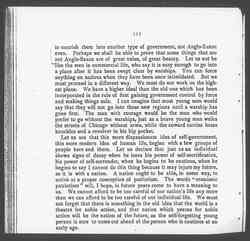 Let us say that some great country,-- only a few years ago we could not have illustrated it from America, and perhaps it is better now not to illustrate it from America,-- let us say that the British have gone into a new country, into a virgin country, and that [page 2] they wish to bring to it the blessings of civilizations and self-government. What does the soldier do? He says, "We must establish law and order. We will do it by peaceful means first, but if we cannot do it that way, we will do it at the point of the bayonet." In the process of establishing law and order he may crush out the very beginnings of self-government. He may kill the most precious germs of some new exotic contribution to the science of human government which this simple people were making. If he were a believer in the creative energy of mankind, if he understood that all progress must come from the native soil, he would say, "I will watch this thing; I will nourish it; I will be careful not to impose upon it old and possibly worn out ideas." He would try to bring it new riches of human interest, new powers of human development. He would have to develop the most wonderful thing in the world, a new combination of people coming together in the line of self-government.