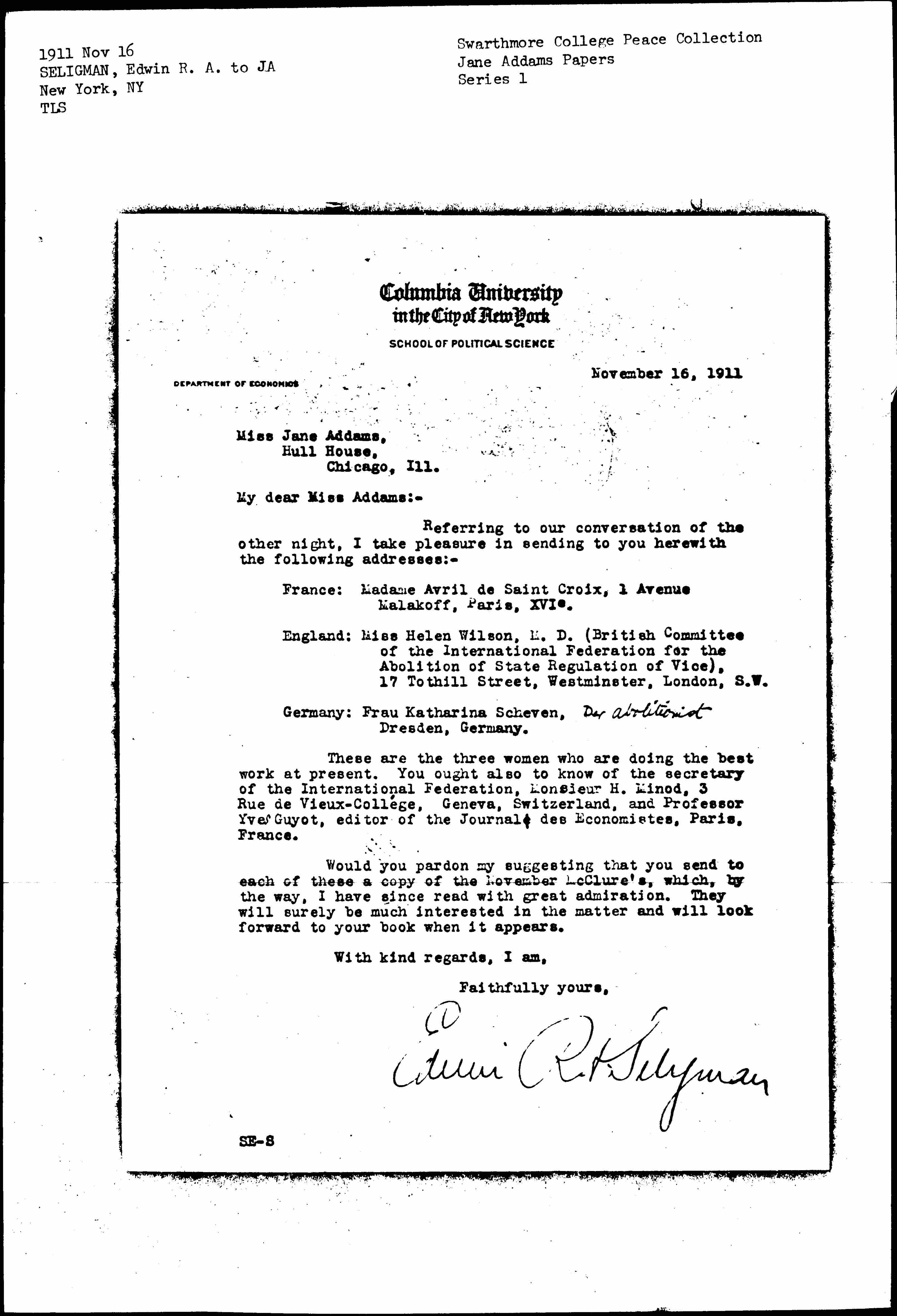 These are the three women who are doing the best work at present. You ought also to know of the secretary of the International Federation, Monsieur H. Minod, 3 Rue de Vieux-College, Geneva, Switzerland, and Professor Yve Guyot, editor of the Journal des Economietes, Paris, France.