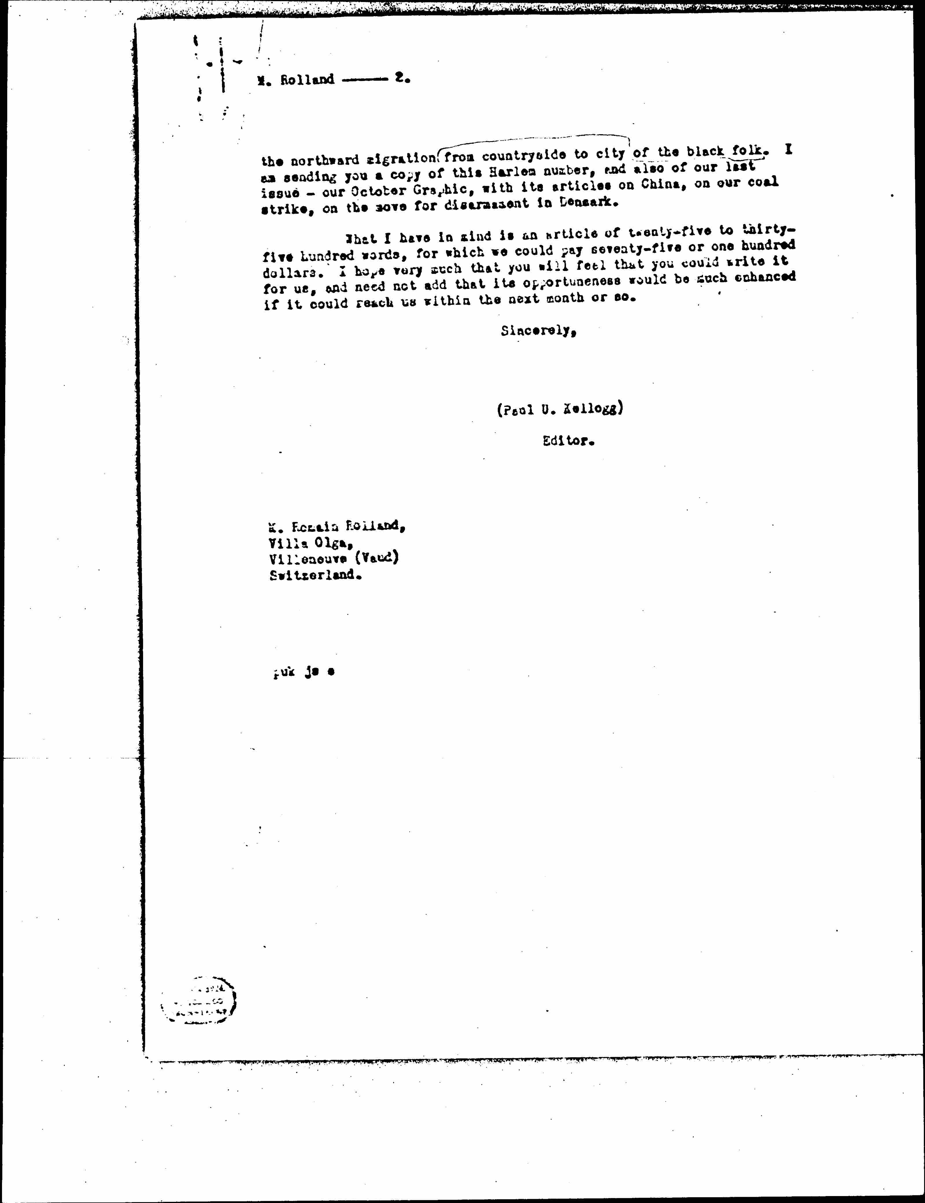 During the last four years we have brought out four special racial numbers which we believe have made for human understanding. One on Ireland at the threshold of the new Free State, to which I.E., James Stephens and Sir Horace Plunkett contributed. One on Russia after seven years revolution, to which Madame Lenin, and others contributed. One on Mexico, which our Mexican friends tell us is the best interpretation that has been made of the racial and cultural revival that underlies their years of civil war. And one last winter on Harlem: Mecca of the New Negro, interpreting on a cultural plane the significance of [page 2] the northward migration of the black folk from countryside to city. I am sending you a copy of this Harlem number, and also of our last issue -- our October Graphic, with its articles on China, on our coal strike, on the move for disarmament in Denmark.