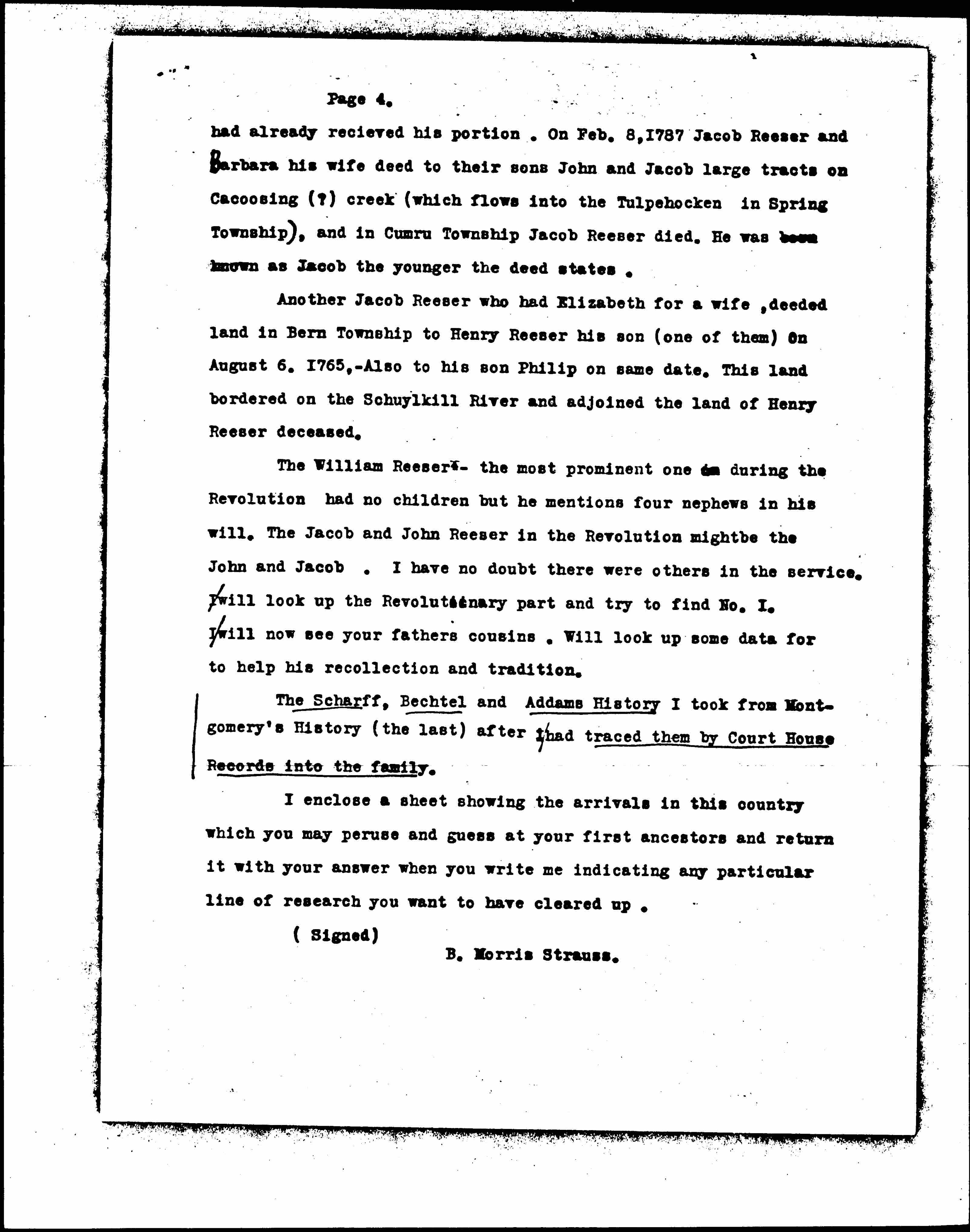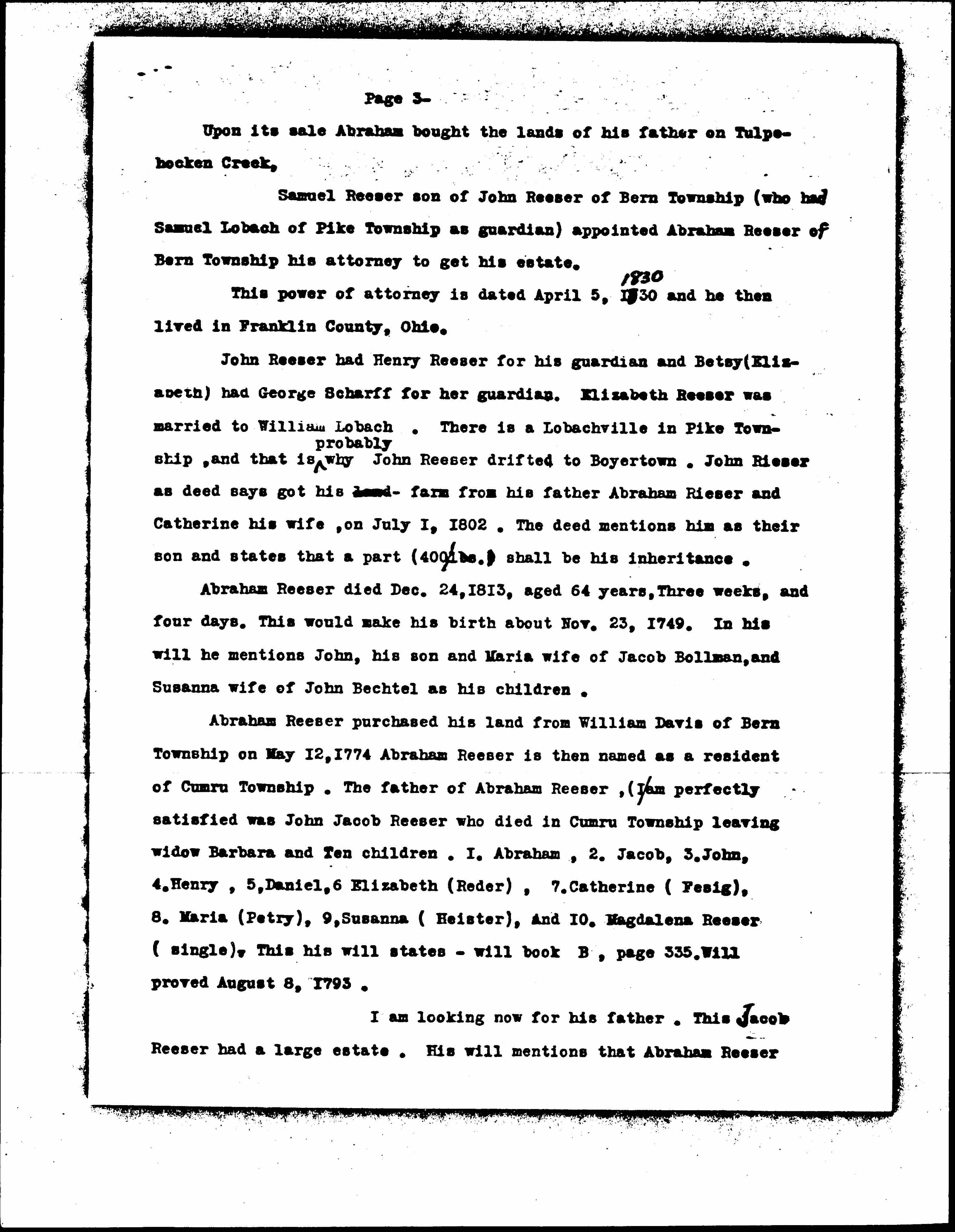 I am looking now for his father. This Jacob Reeser had a large estate. His will mentions that Abraham Reeser [page 4] had already received his portion. On Feb. 8, 1787 Jacob Reeser and Barbara his wife deed to their sons John and Jacob large tracts on Cacoosing (?) Creek (which flows into the Tulpehocken in Spring Township), and in Cumru Township Jacob Reeser died. He was been known as Jacob the younger the deed states.