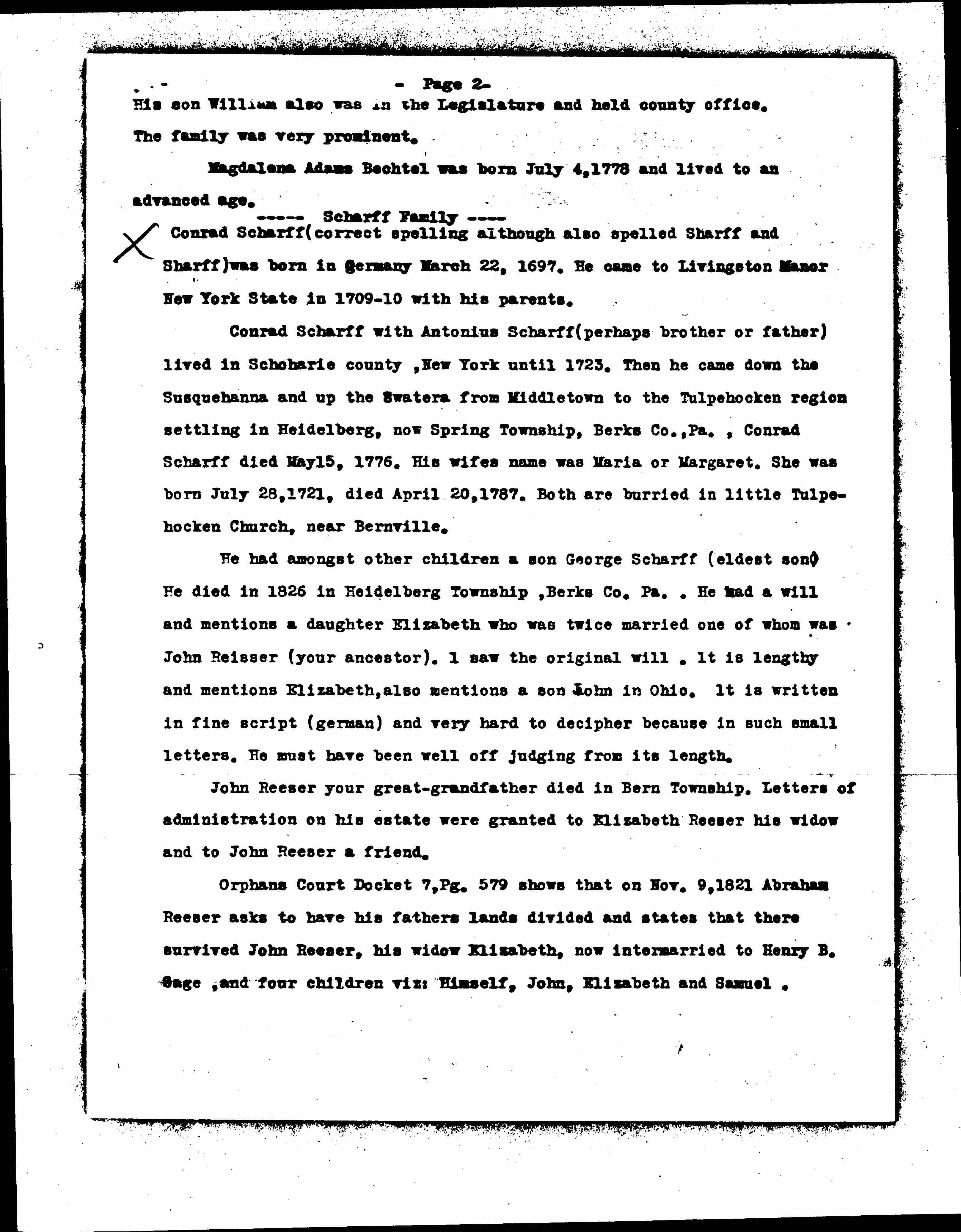 The Scharff, Bechtel and Addams History I took from Montgomery's History (the last) after I had traced them by Court House Records into the family.