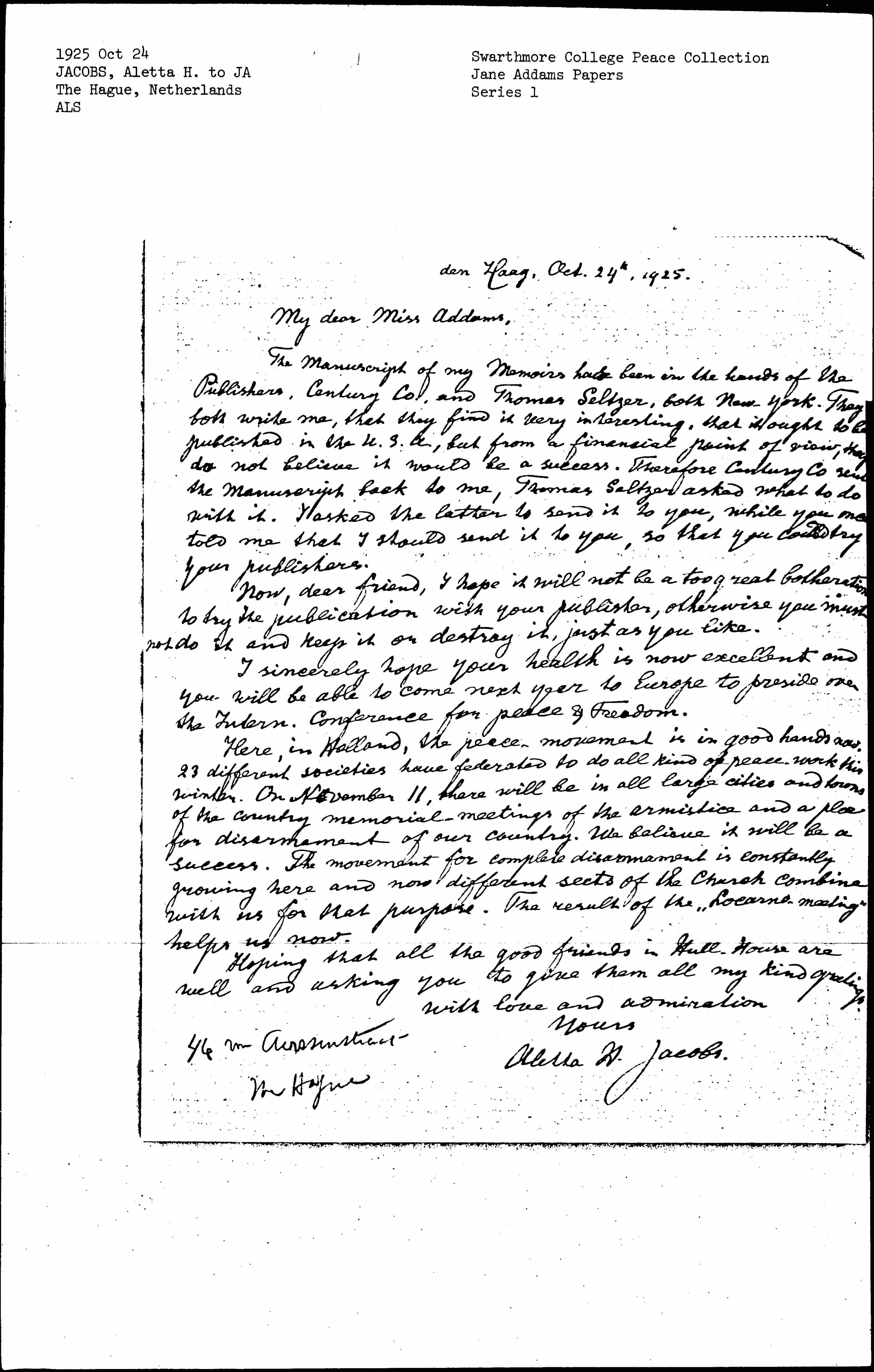 Here, in Holland, the peace-movement is in good hands now. 23 different societies have federated to do all kind of peace-work this winter. On November 11, there will be in all large cities and towns of the country memorial-meetings of the armistice and a plea for disarmament of our country. We believe it will be a success. The movement for complete disarmament is constantly growing here and now different sects of the church combine with us for that purpose. The result of the "Locarno meeting" helps us now.