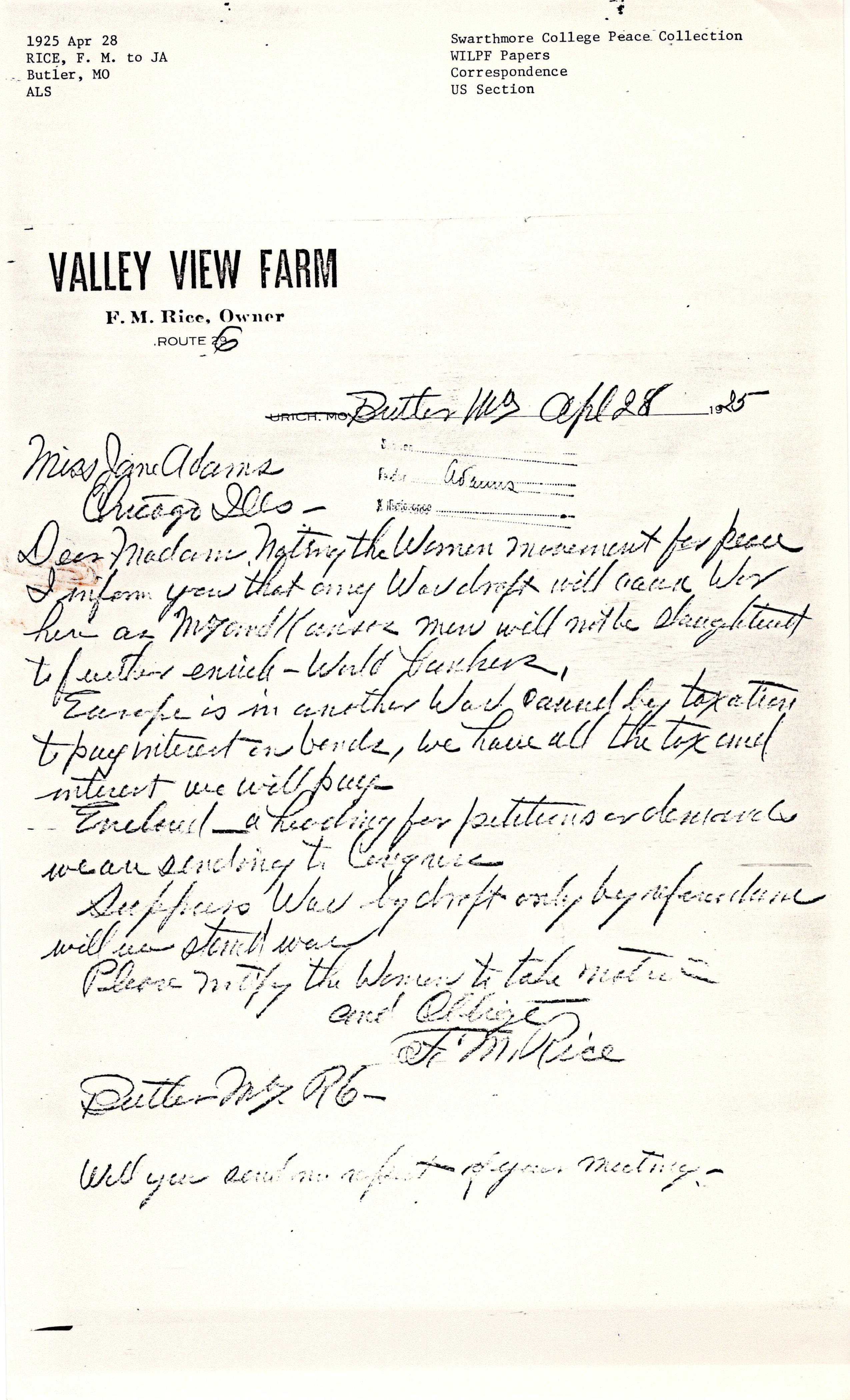 Dear Madam [Noting] the Women's Movement for peace I inform you that any War draft will cause War here as Mo and Kansas men will not be slaughtered to further enrich -- World bankers.