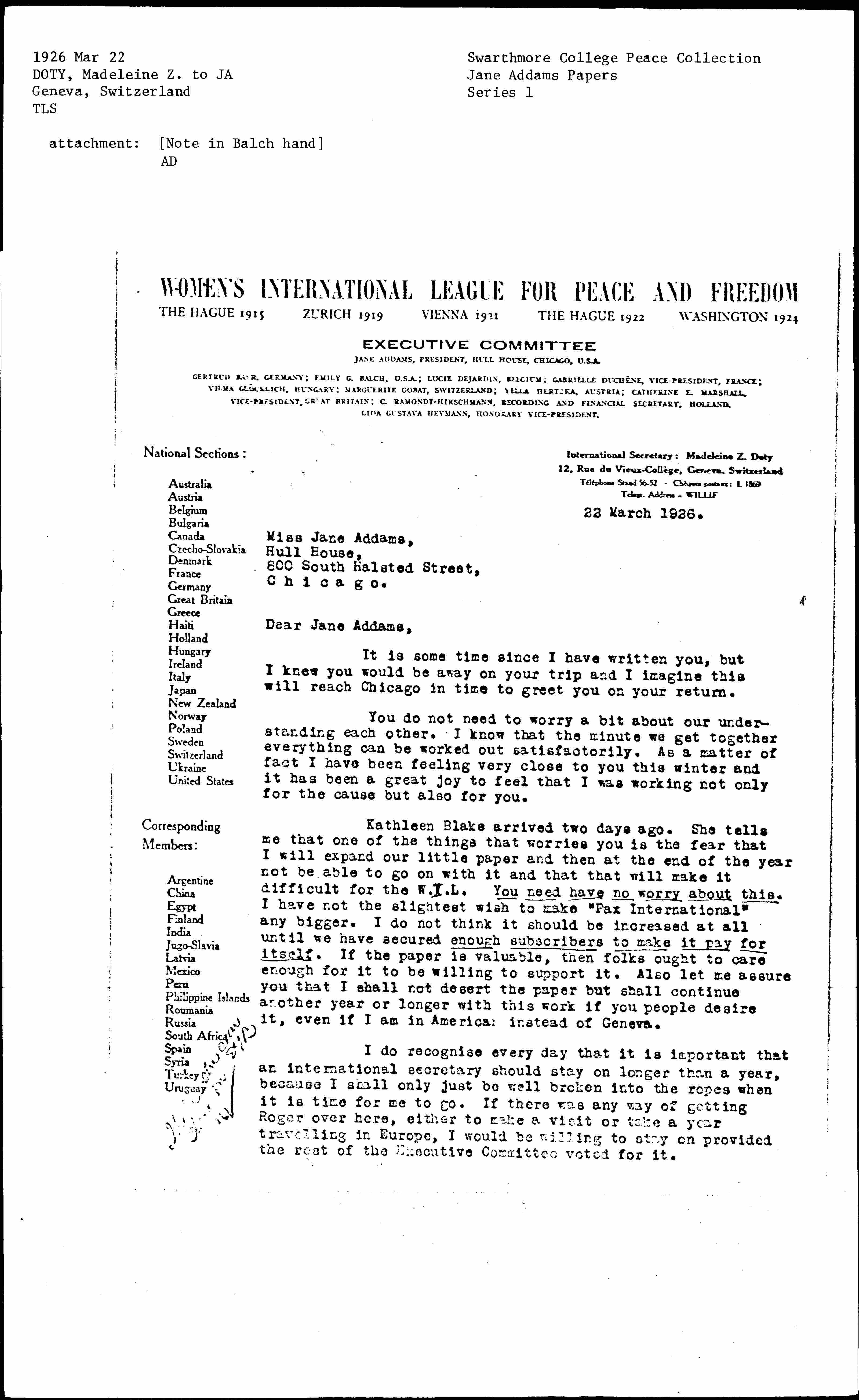 P.S. I note what you say about international dues. I have [made] no attempt whatever to have the U.S. pay dues here. In the little leaflet I sent out asking everybody to pay promptly, I gave the address of Dorothy Detzer of the Washington office. The only trouble with this arrangement is that until this past week I have not had the name of one international member in the U.S.A. who joined since I left America. Now of course a lot of people have joined, and it is I think very bad for me not to receive their names so that I could send them the International membership card from this office. This last week I have had from Dorothy [Detzer] about 30 names, but I feel sure there must be more than that in all these months.