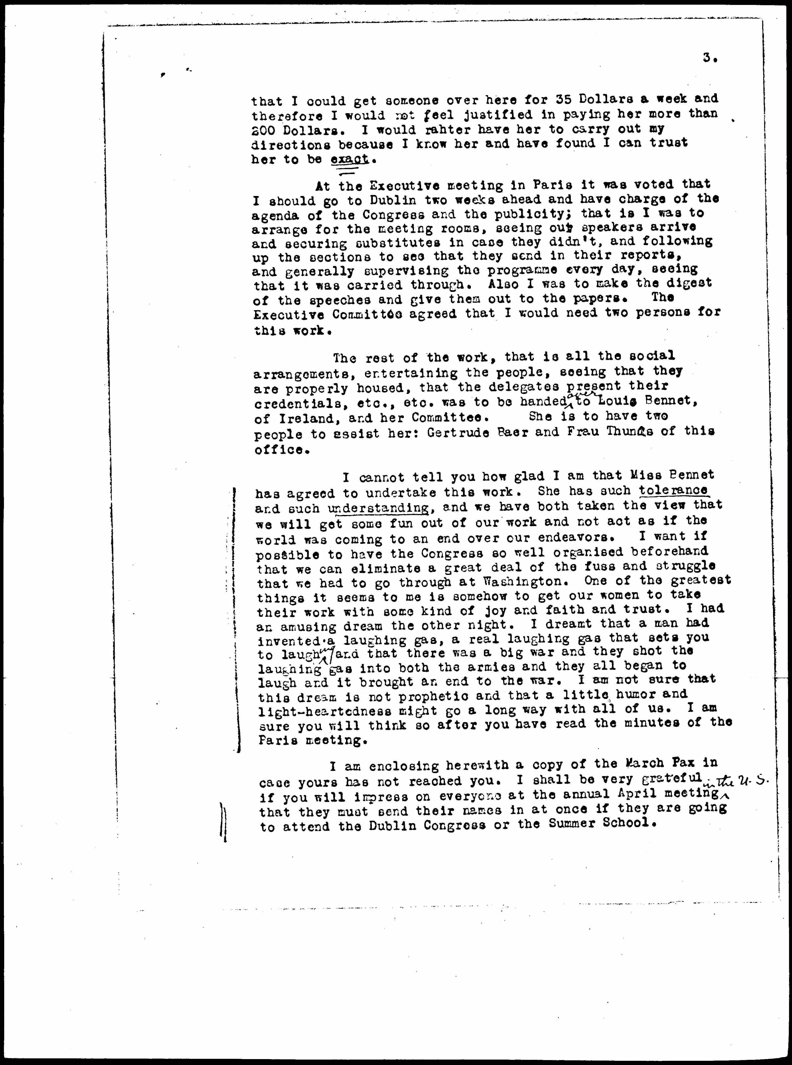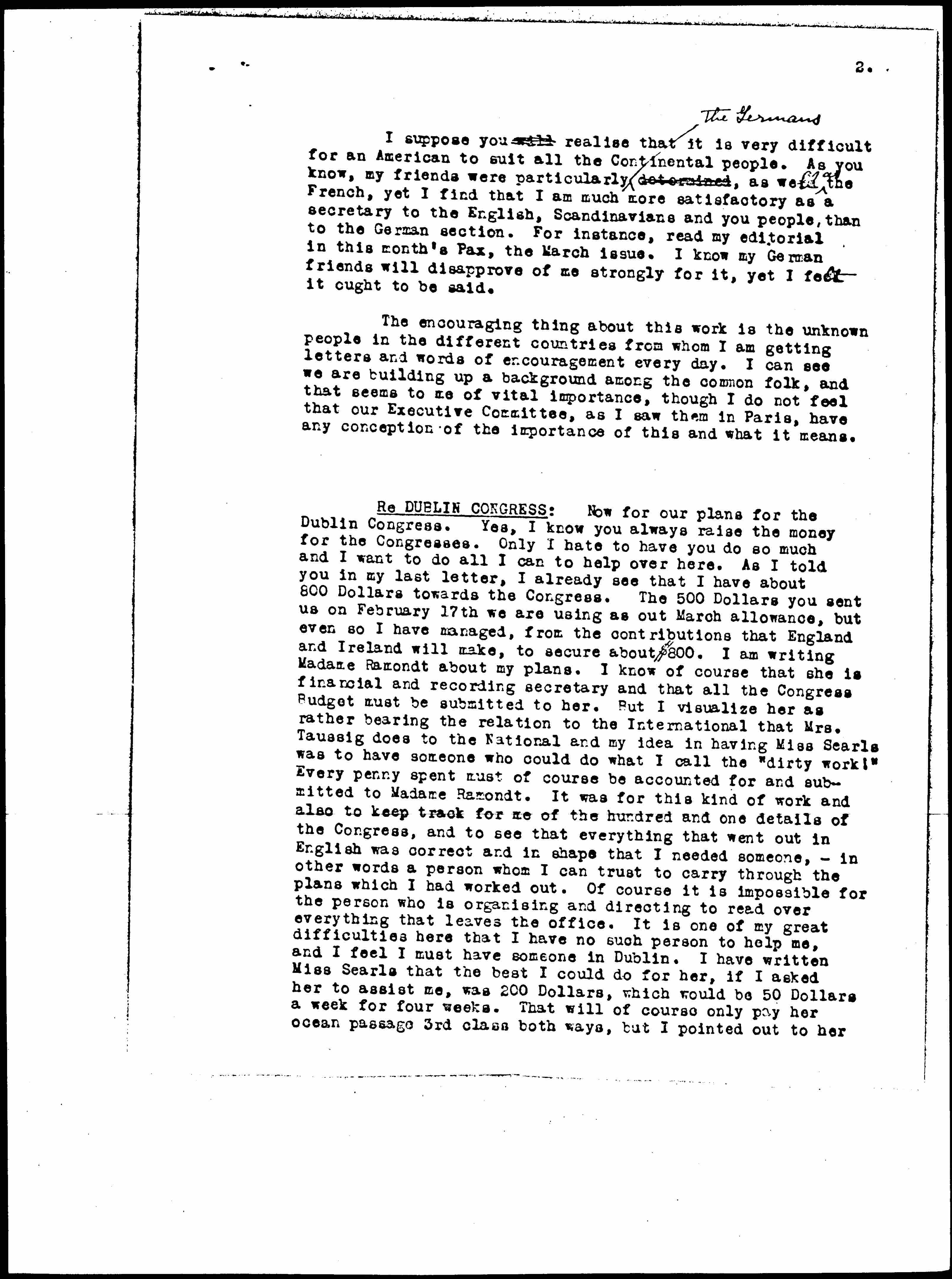 Re DUBLIN CONGRESS: Now for our plans for the Dublin Congress. Yes, I know you always raise the money for the Congresses. Only I hate to have you do so much and I want to do all I can to help over here. As I told you in my last letter, I already see that I have about 800 Dollars towards the Congress. The 500 Dollars you sent us on February 17th we are using as our March allowance, but even so I have managed, from the contributions that England and Ireland will make, to secure about ↑$↓800. I am writing Madame Ramondt about my plans. I know of course that she is financial and recording secretary and that all the Congress Budget must be submitted to her. But I visualize her as rather bearing the relation to the International that Mrs. Taussig does to the National and my idea in having Miss [Surles] was to have someone who could do what I call the "dirty work!" Every penny spent must of course be accounted for and submitted to Madame Ramondt. It was for this kind of work and also to keep track for me of the hundred and one details of the Congress, and to see that everything that went out in English was correct and in shape that I needed someone, -- in other words a person whom I can trust to carry through the plans which I had worked out. Of course it is impossible for the person who is [organizing] and directing to read over everything that leaves the office. It is one of my great difficulties here that I have no such person to help me, and I feel I must have someone in Dublin. I have written Miss [Surles] that the best I could do for her, if I asked her to assist me, was 200 Dollars, which would be 50 Dollars a week for four weeks. That will of course not only pay her ocean passage 3rd class both ways, but I pointed out to her [page 3] that I could get someone over here for 35 Dollars a week and therefore I would not feel justified in paying her more than 200 Dollars. I would rather have her to carry out my directions because I know her and have found I can trust her to be exact.