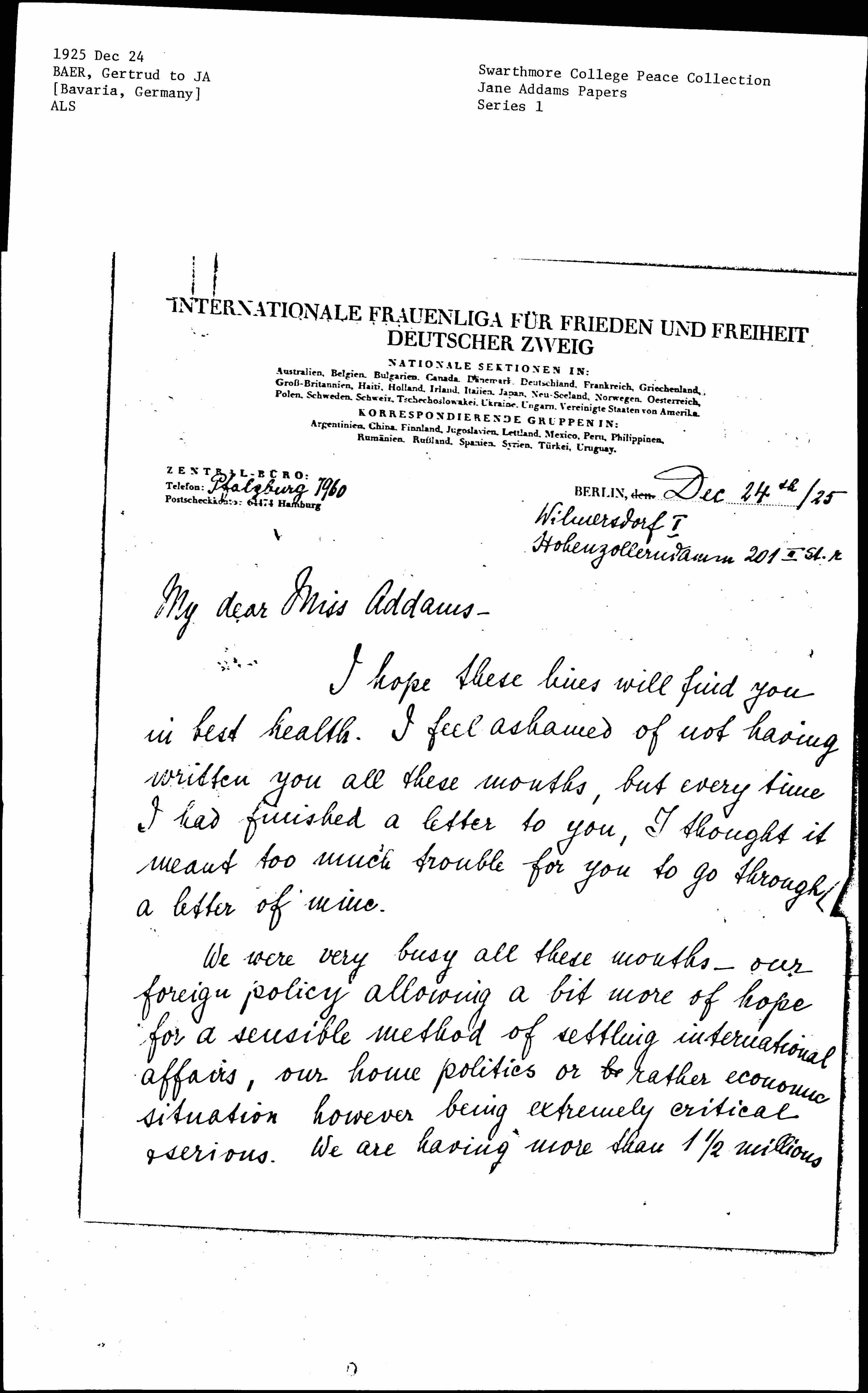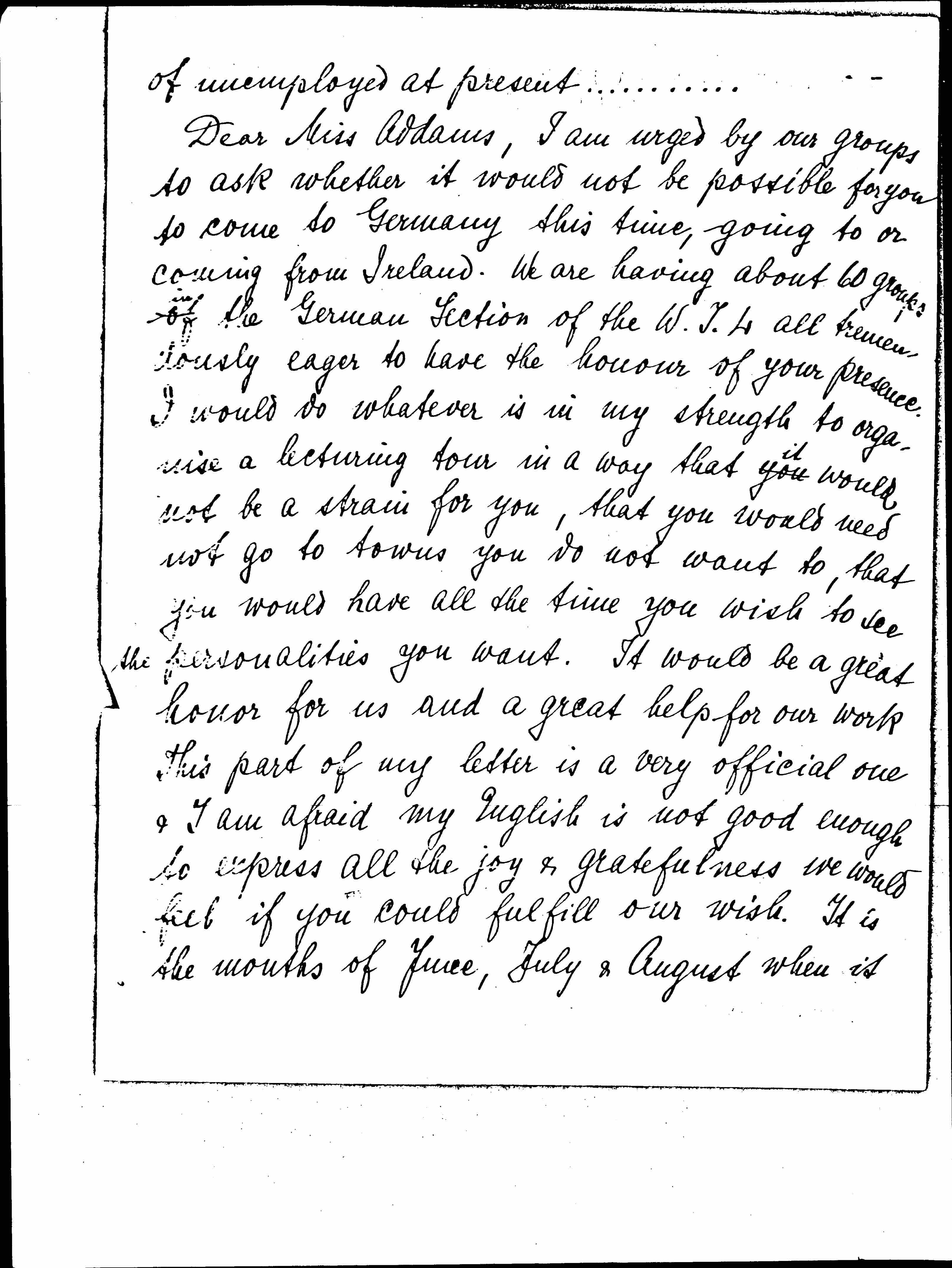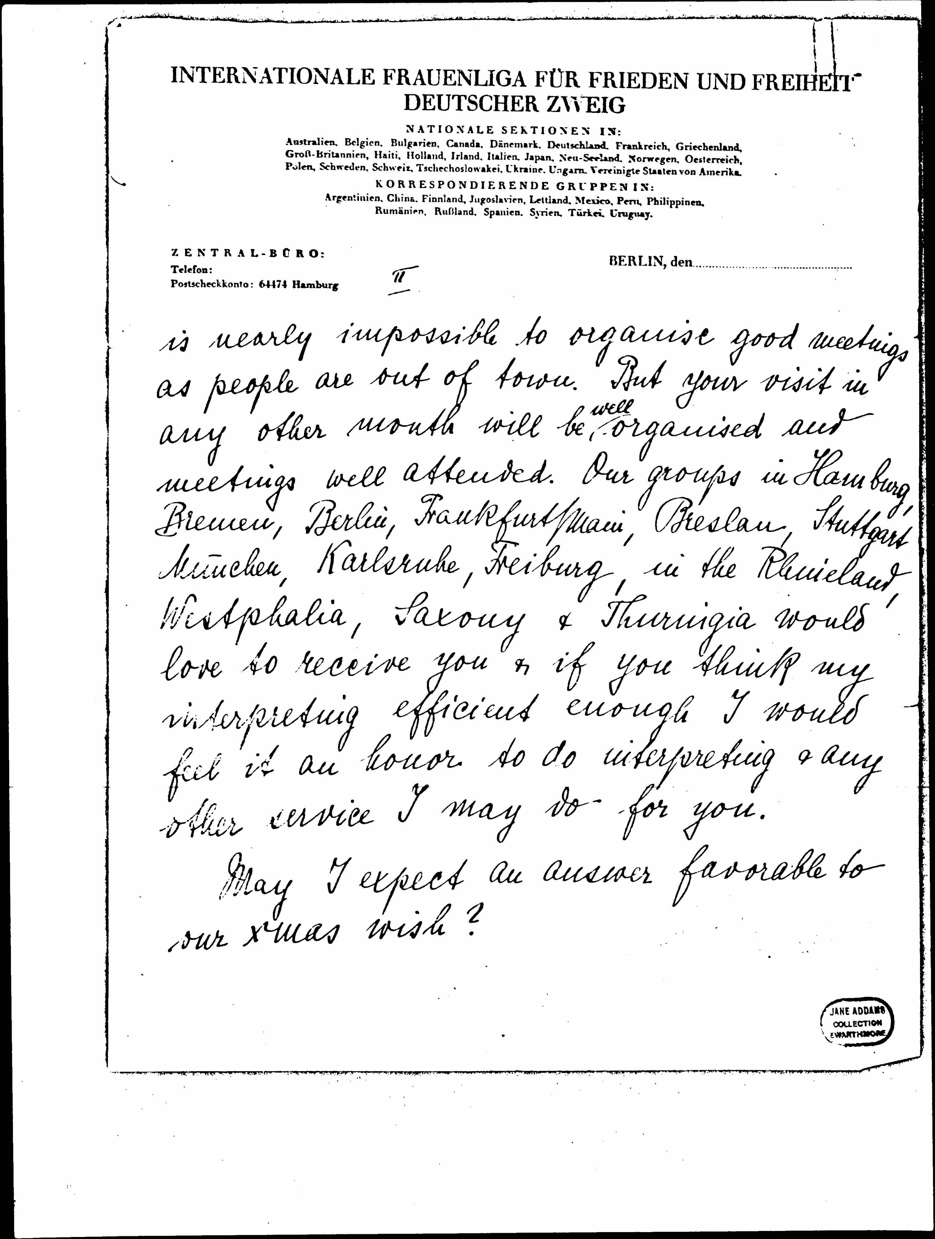 Dear Miss Addams, I am urged by our groups to ask whether it would not be possible for you to come to Germany this time, going to or coming from Ireland. We are having about 60 groups of ↑in↓ the German Section of the W.I.L. all tremendously eager to have the [honor] of your presence. I would do whatever is in my strength to organize a lecturing tour in a way that you ↑it↓ would not be a strain for you, that you would need not go to towns you do not want to, that you would have all the time you wish to see ↑the↓ personalities you want. It would be a great honor for us and a great help for our work. This part of my letter is a very official one & I am afraid my English is not good enough to express all the joy & gratefulness we would feel if you could fulfill our wish. It is the months of June, July & August when it [page 3] is nearly impossible to [organize] good meetings as people are out of town. But your visit in any other month will be ↑well↓ [organized] and meetings well attended. Our groups in Hamburg, Bremen, Berlin, Frankfurt [am Main], Breslau, Stuttgart, [Munich], Karlsruhe, Freiburg, in the Rhineland, Westphalia, Saxony & Thuringia would love to receive you & if you think my interpreting efficient enough I would feel it an honor to do interpreting & any other service I may do for you.