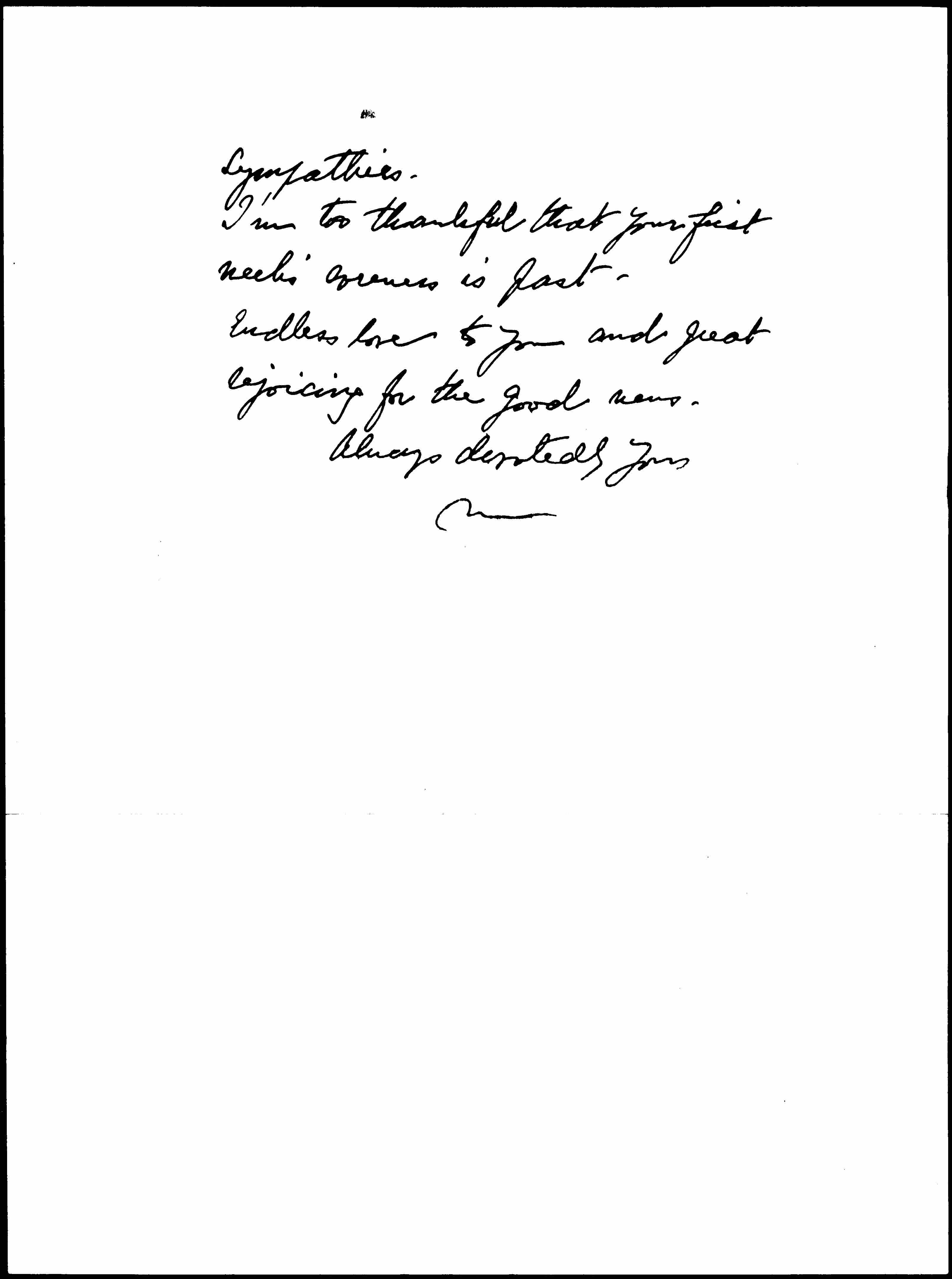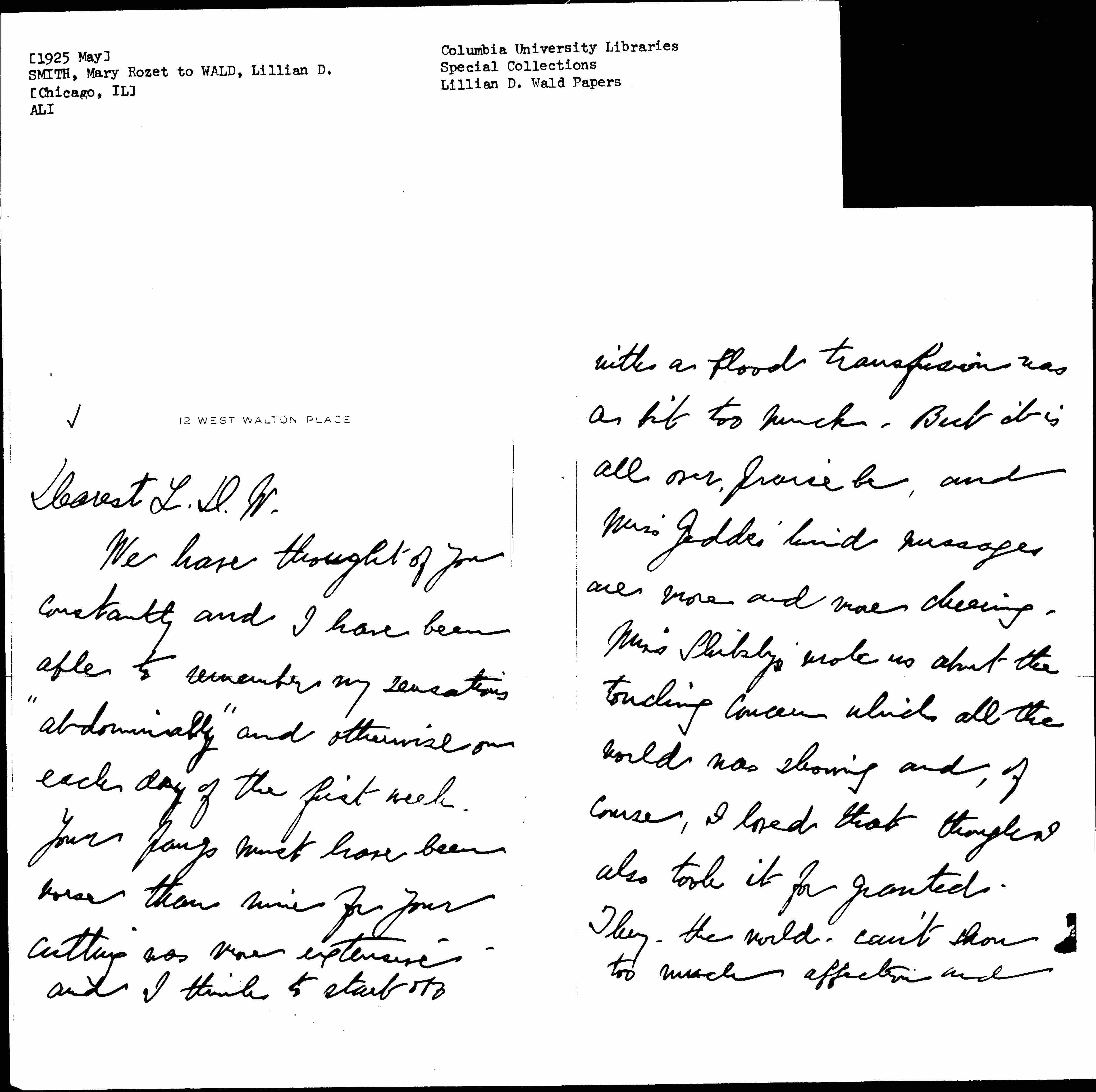 We have thought of you constantly and I have been able to remember my sensations “abdominally” and otherwise on each day of the first week. Your pangs must have been worse than mine for your cutting was more extensive and I think to start off [page 2] with a blood transfusion was a bit too much. But it is all over, praise be, and Miss Geddes' kind messages are more and more cheering. Miss Shilsby's note to us about the touching concern which all the world was showing and, of course, I loved that though I also took it for granted. They -- the world -- can’t show too much affection and [page 3] gratitude. Much more is "owing" you than you'll ever get.