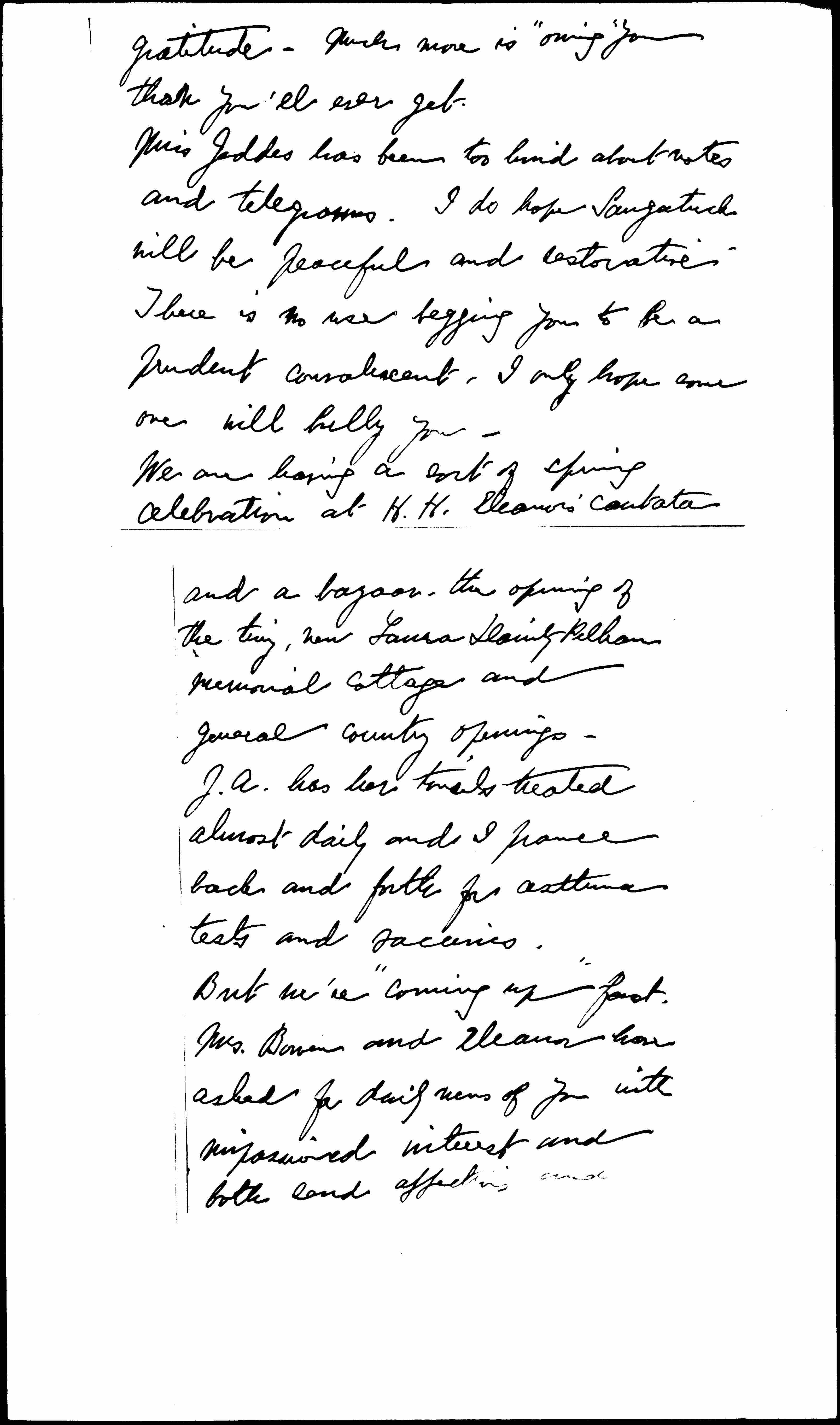 But we're "coming up" fast. Mrs. Bowen and Eleanor have asked for daily news of you with impassioned interest and both send affection and [page 5] sympathies.