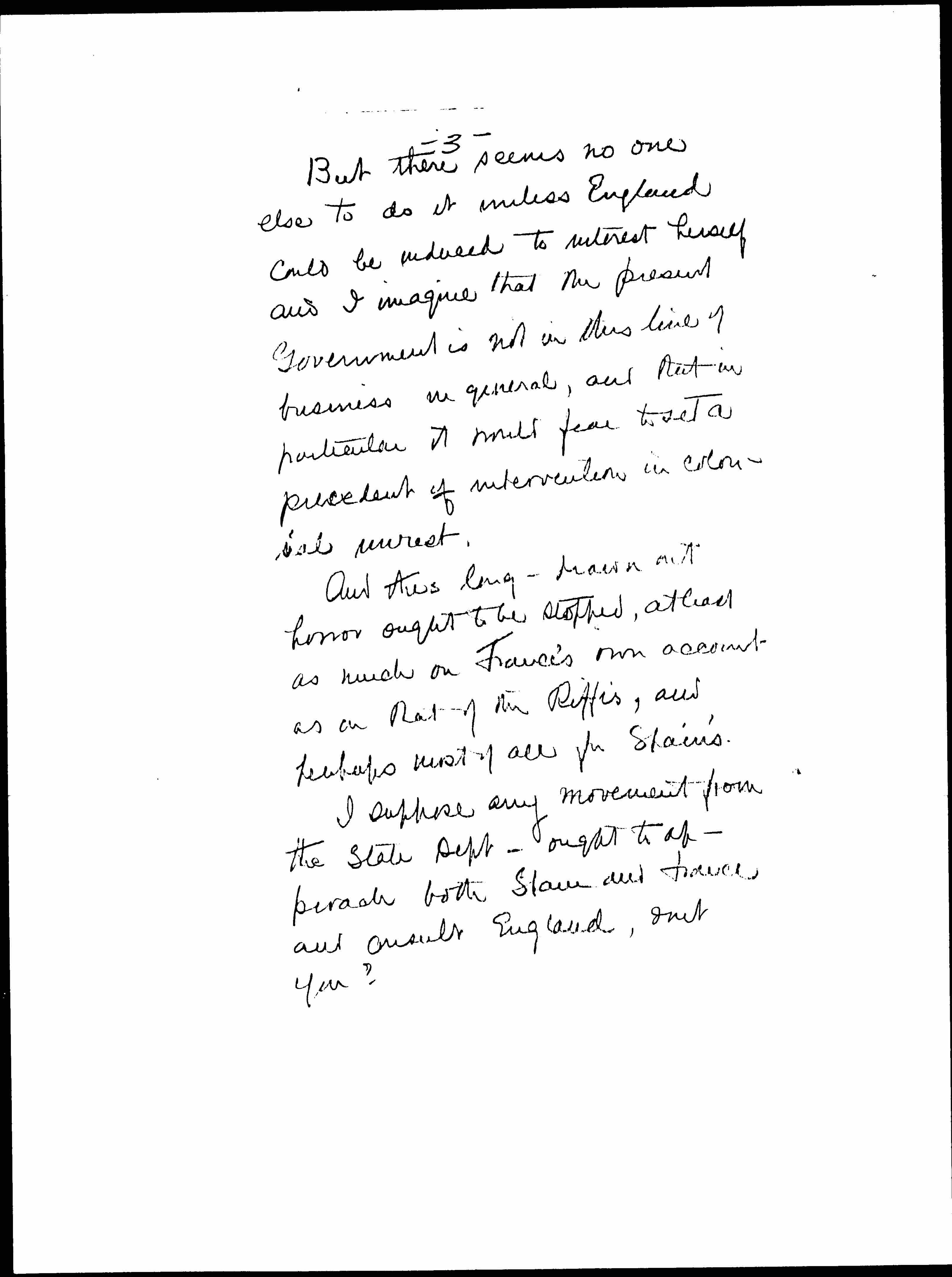 But there seems no one else to do it unless England could be induced to interest herself and I imagine that the present Government is not in this line of business in general, and that in particular it would fear to set a precedent of intervention in colonial unrest.