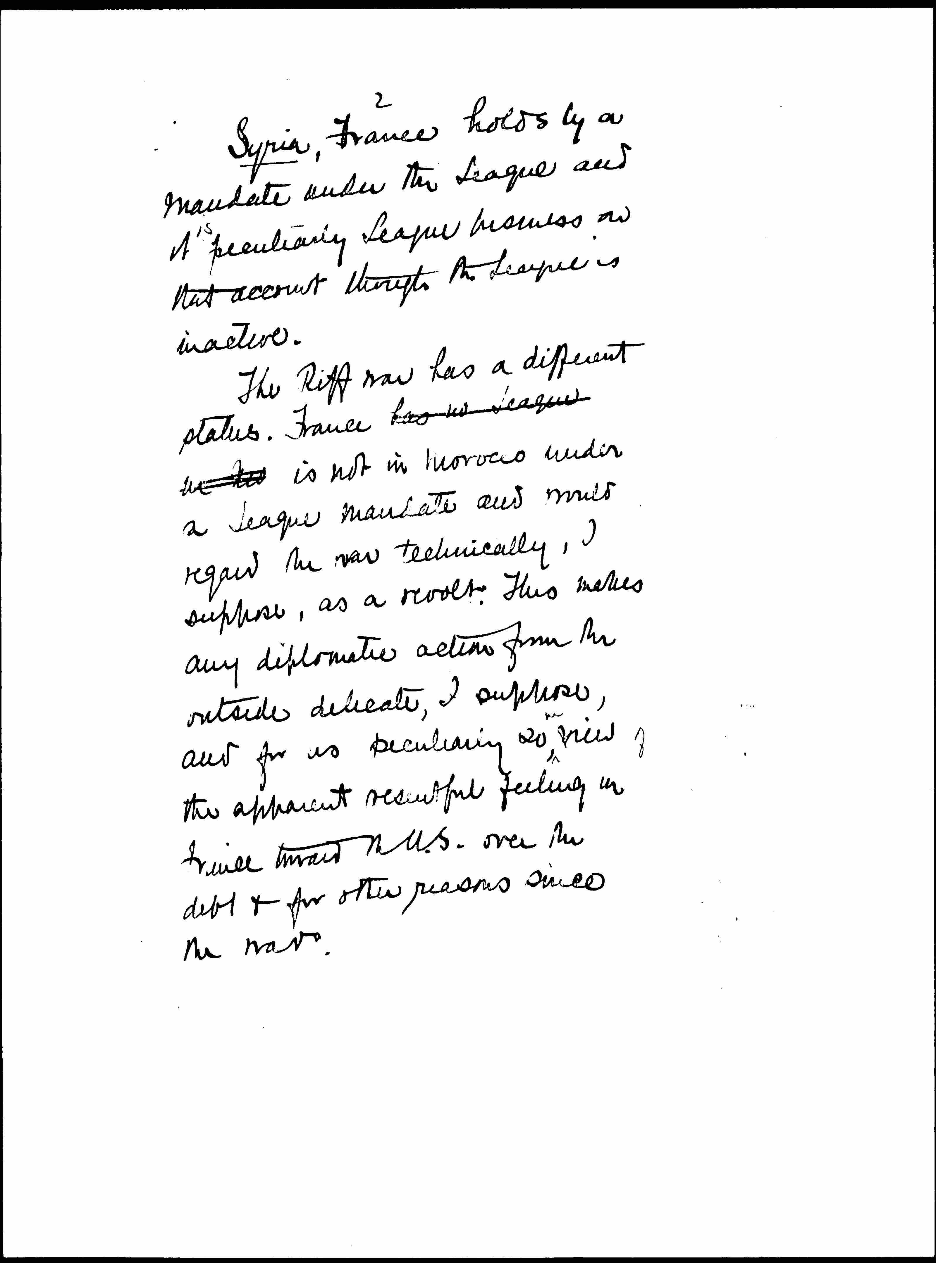 The [Rif] war has a different status. France has no League [illegible] is not in Morocco under a League mandate and would regard the war technically, I suppose, as a revolt. This makes any diplomatic action from the outside delicate, I suppose, and for us peculiarly so ↑in↓ view ↑of↓ the apparent resentful feeling in France toward the U.S. over the debt & for other reasons since the war. [page 3]