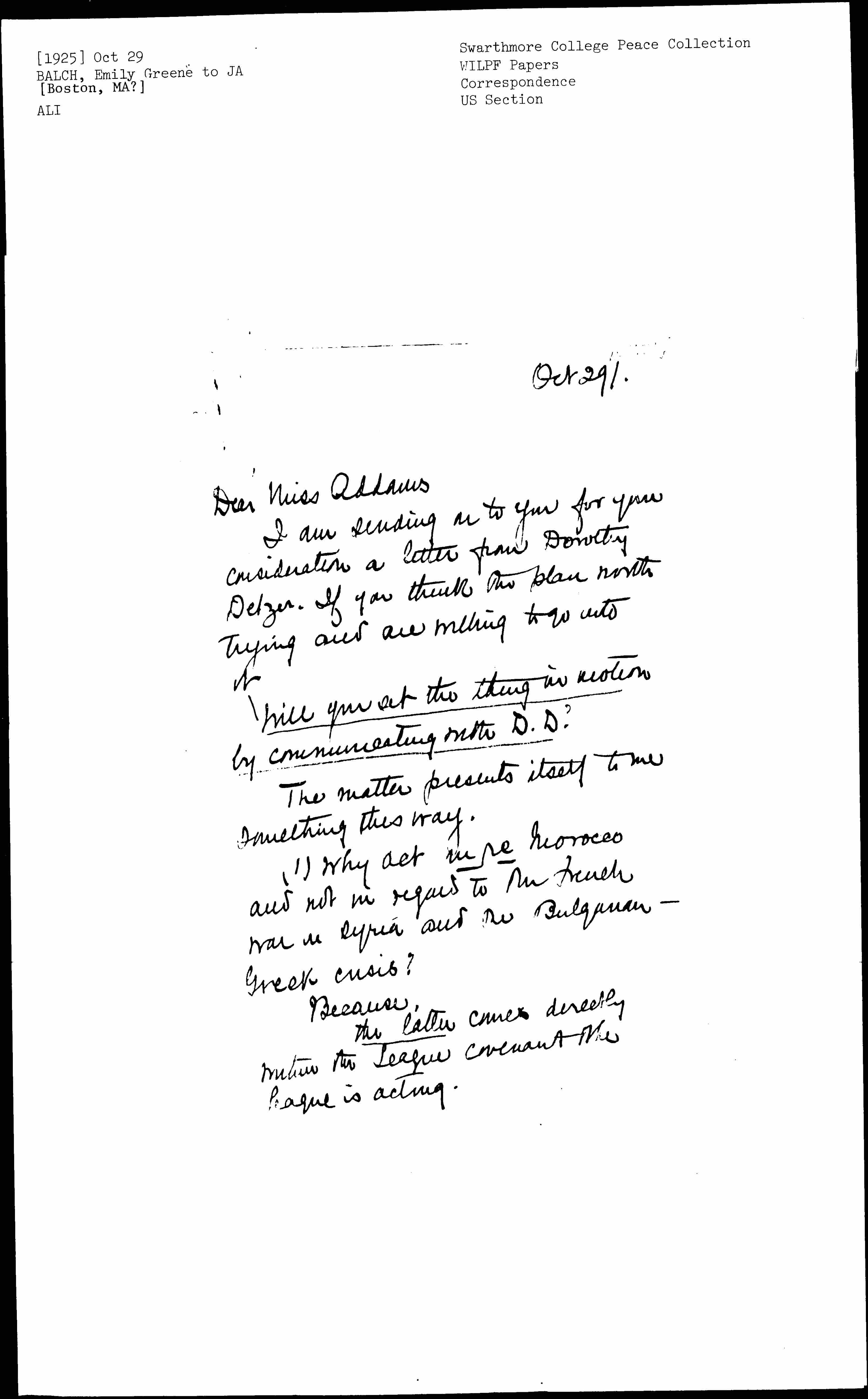I am sending on to you for your consideration a letter from Dorothy Detzer. If you think the plan worth trying and are willing to go into it