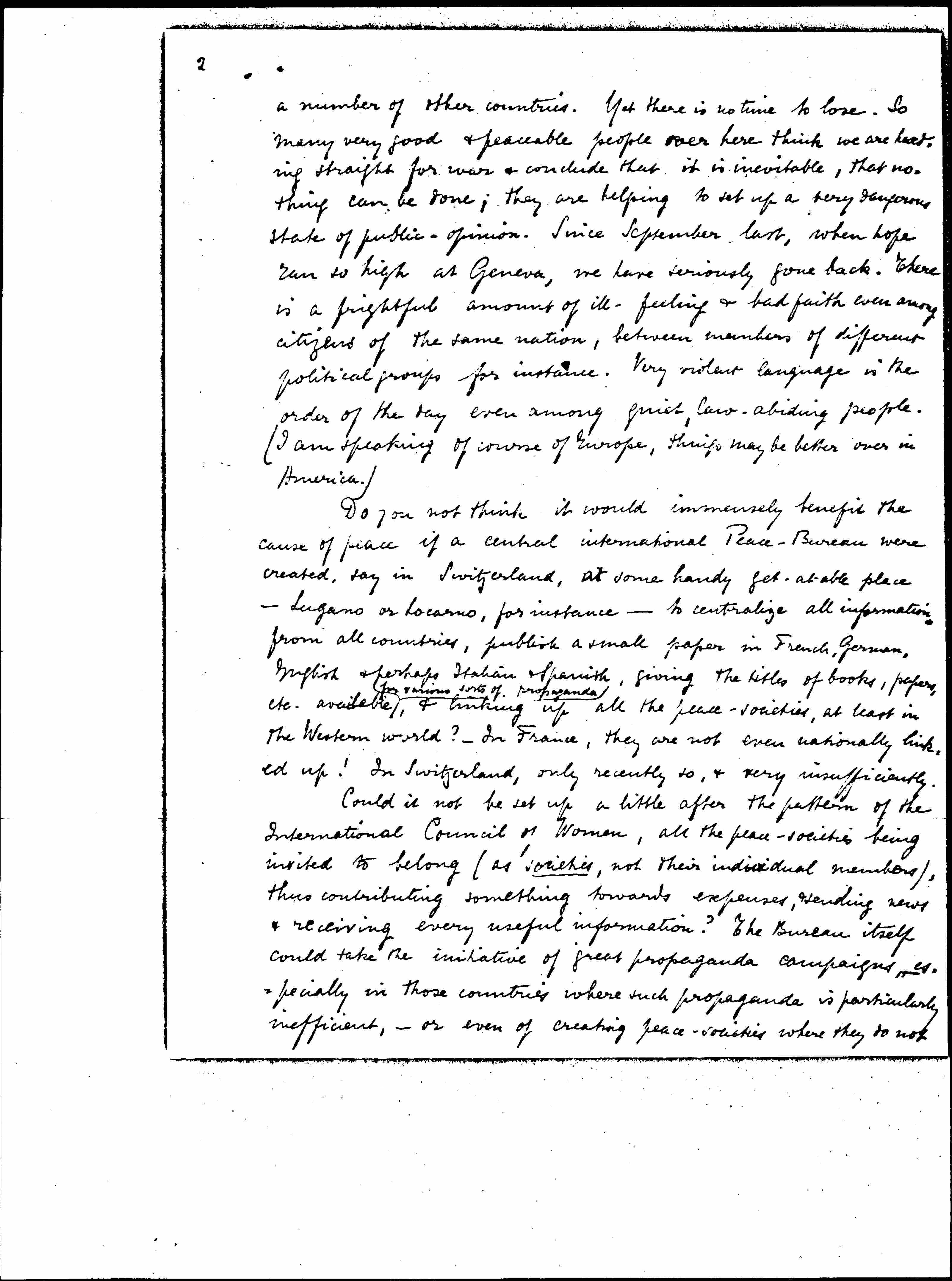 Do you not think it would immensely benefit the cause of peace if a central international Peace-Bureau were created, say in Switzerland, at some handy get-atable place -- Lugano or Locarno, for instance -- to centralize all information, from all countries, publish a small paper in French, German, English & perhaps Italian & Spanish, giving the titles of books, papers, etc. available ↑for various sorts of propaganda↓ & linking up all the peace-societies, at least in the Western World? -- In France, they are not even nationally linked up! In Switzerland, only recently so, & very insufficiently.