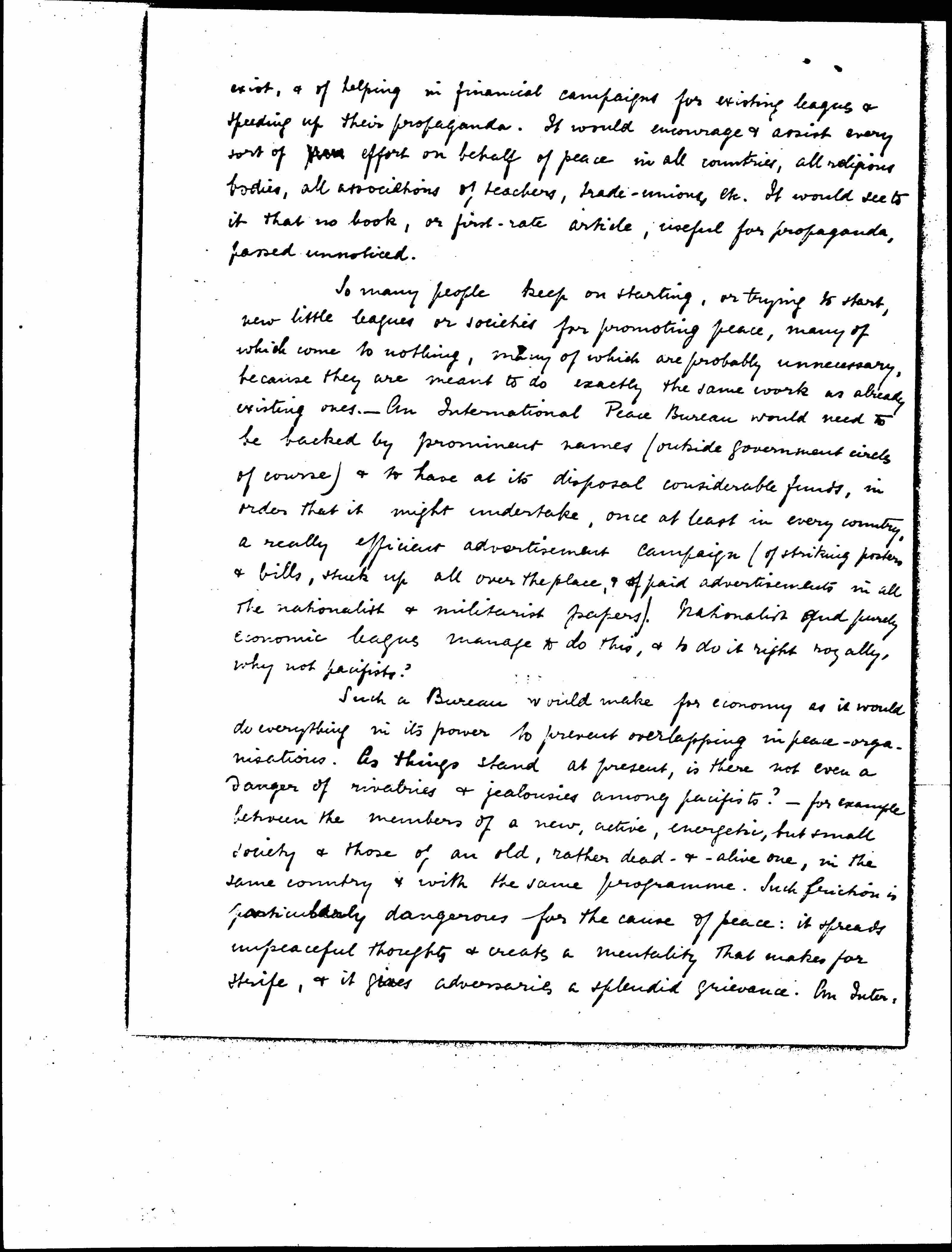 So many people keep on starting, or trying to start, new little leagues or societies for promoting peace, many of which come to nothing, many of which are probably unnecessary, because they are meant to do exactly the same work as already existing ones. -- An International Peace Bureau would need to be backed by prominent names (outside government circles of course) & to have at its disposal considerable funds, in order that it might undertake, once at least in every country, a really efficient advertisement campaign (of striking posters & bills, stuck up all over the place, & of paid advertisements in all the nationalist & militarist papers). Nationalist and purely economic leagues manage to do this, & do it right royally, why not pacifists?