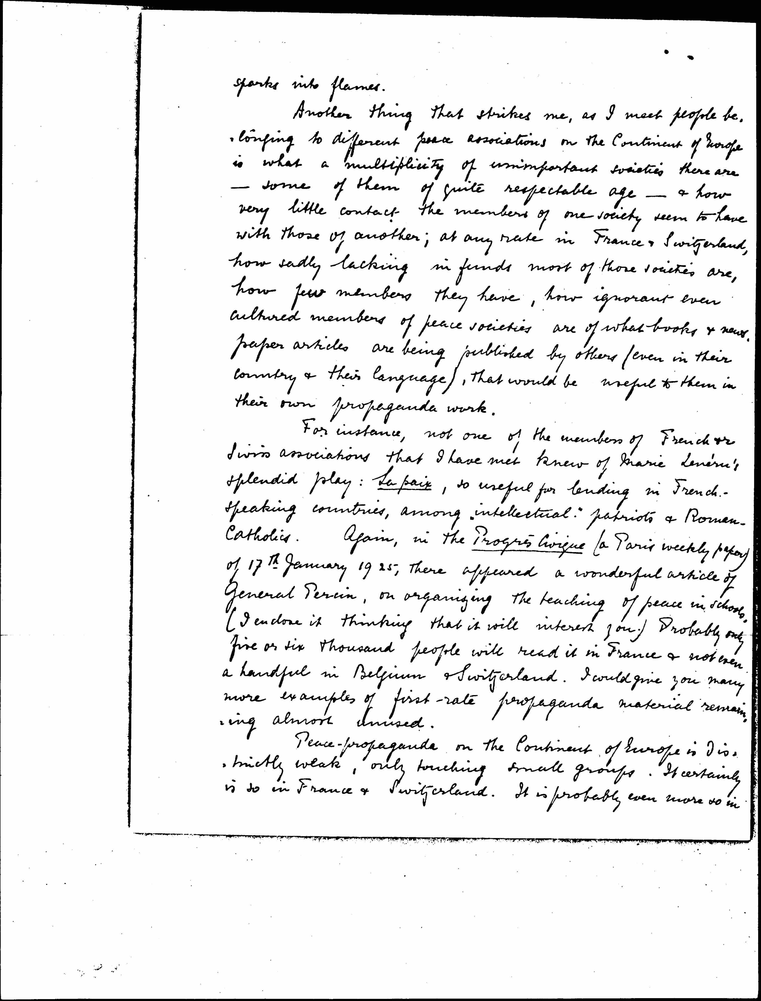 For instance, not one of the members of French or Swiss associations that I have met knew of Marie Lenèru's splendid play: La Paix, so useful for lending in French-speaking countries, among "intellectual" patriots & Roman-Catholics. Again, in the Progrès Civique (a Paris weekly paper) of 17th January 1925, there appeared a wonderful article of General Percin, on organizing the teaching of peace in schools. (I enclose it thinking that it will interest you.) Probably only five or six thousand people will read it in France & not even a handful in Belgium & Switzerland. I would give you many more examples of first-rate propaganda material remaining almost unused.