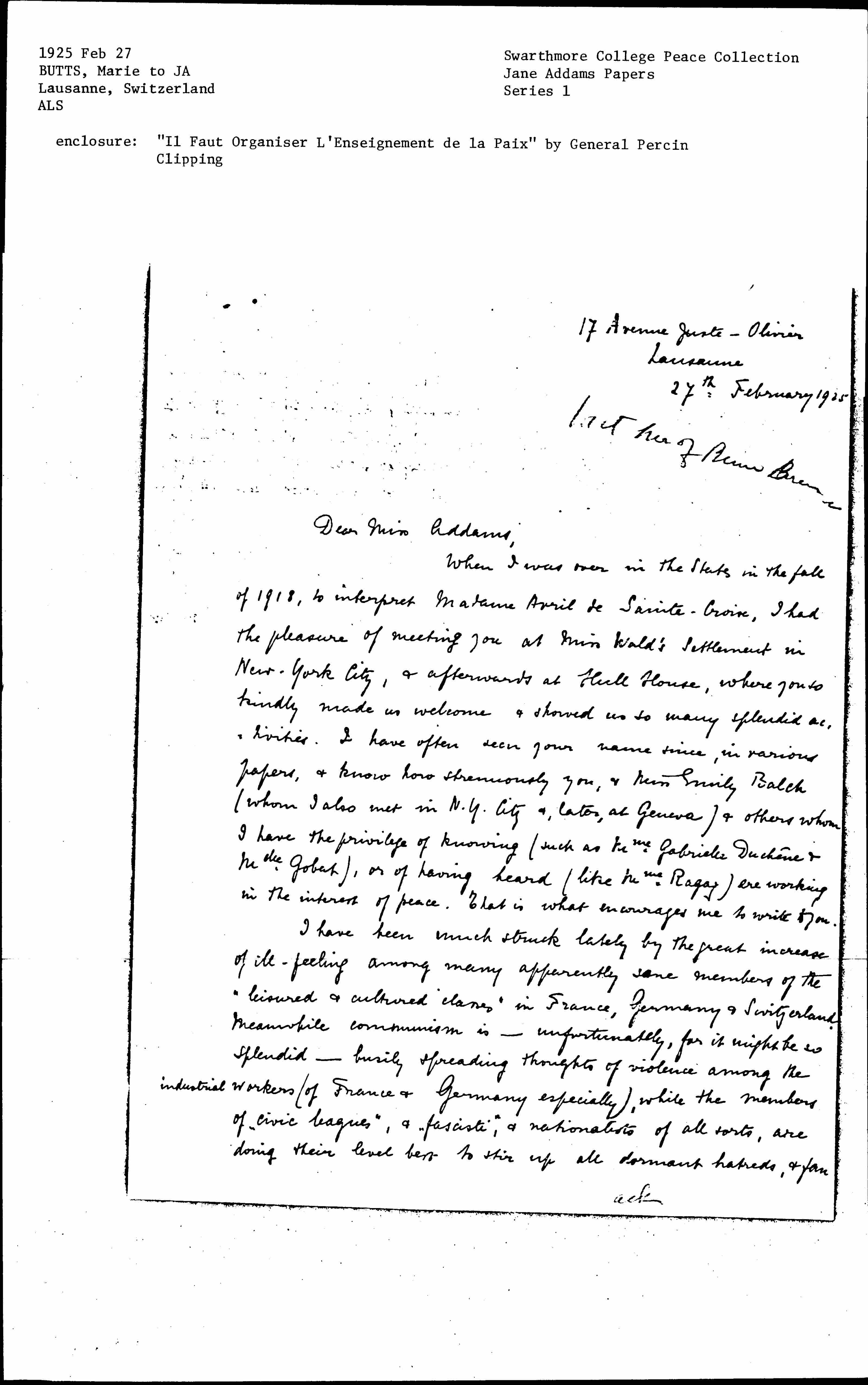 When I was over in the States in the fall of 1918, to interpret Avril de Sainte-Croix, I had the pleasure of meeting you at Miss Wald's Settlement in New-York City, & afterwards at Hull House, where you so kindly made us welcome & showed us so many splendid activities. I have often seen your name since, in various papers, & know how strenuously you, & Miss Emily Balch (whom I also met in N.Y. City &, later, at Geneva) & others whom I have the privilege of knowing (such as Mme Gabrielle Duchêne & [Mde] Gobat), or of having heard (like Mme Ragaz) are working in the interest of peace. That is what encourages me to write to you.
