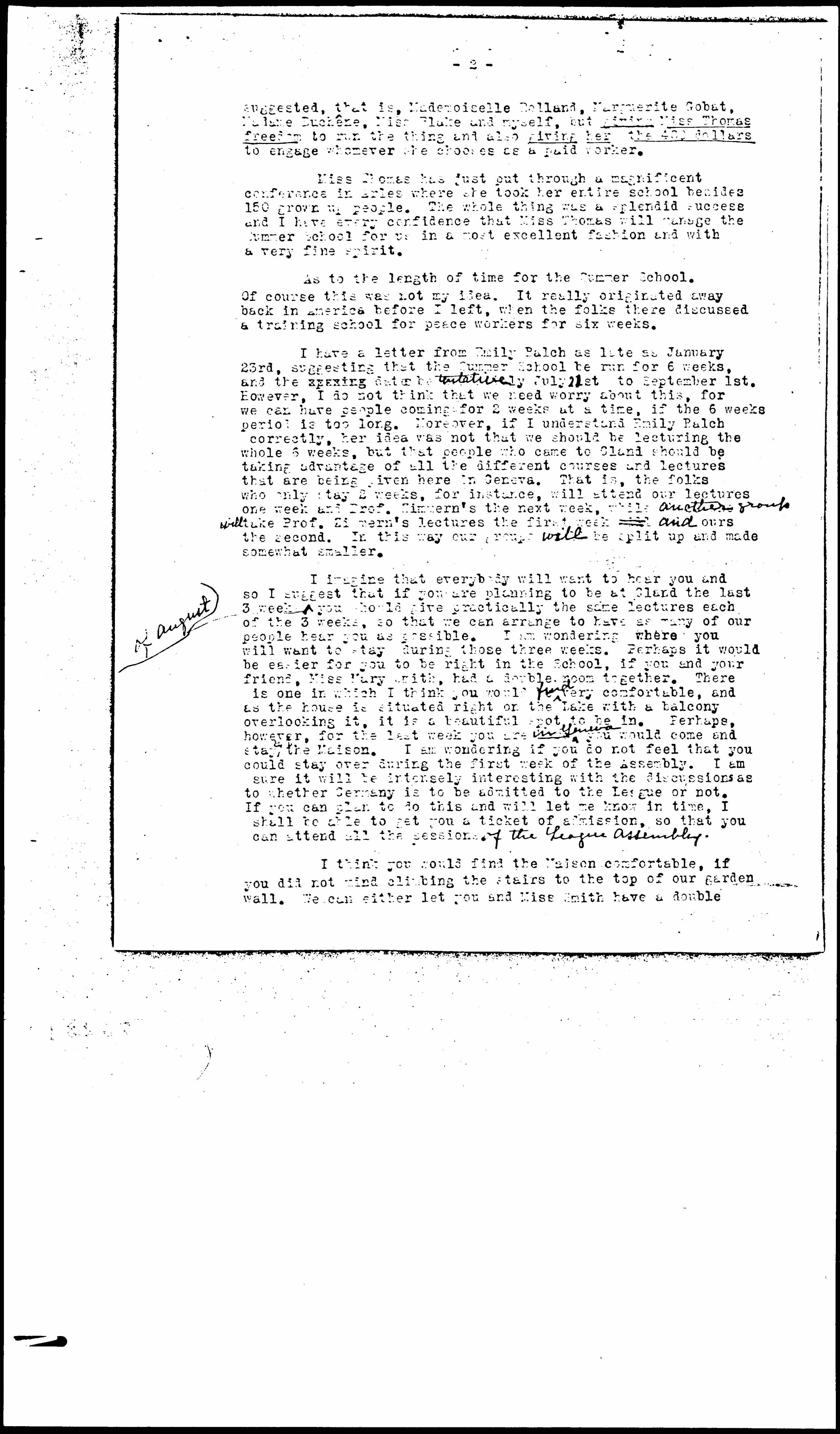 SUMMER SCHOOL: I was very sorry that Miss Blake was not willing to undertake the responsibility of the Summer School, but she really did discuss this matter with me before I left America and I have in my possession a letter of January 7th in which I wrote to her saying that I hoped she would do ↑this↓ when she arrived and also, if you will remember, I put a statement in the January "Pax," that Miss Blake was coming over for the purpose of helping us with the School. I think the difficulty is that Miss Blake is very tired out, which after all is natural after 50 years of teaching. It is evident that she wants no responsibility. She is willing to answer letters provided every little detail is talked out with me, but of course there is so much other work for me to do here that that is really not possible. I am sure the thing for me to do is to put the whole matter into Miss Thomas' hands, [organizing] a little committee around her, such as I [page 2] suggested, that is, Mademoiselle Rolland, Marguerite Gobat, Madame Duchêne, Miss Blake and myself, but giving Miss Thomas freedom to run the thing and also giving her the 400 dollars to engage whomever she chooses as a paid worker.
