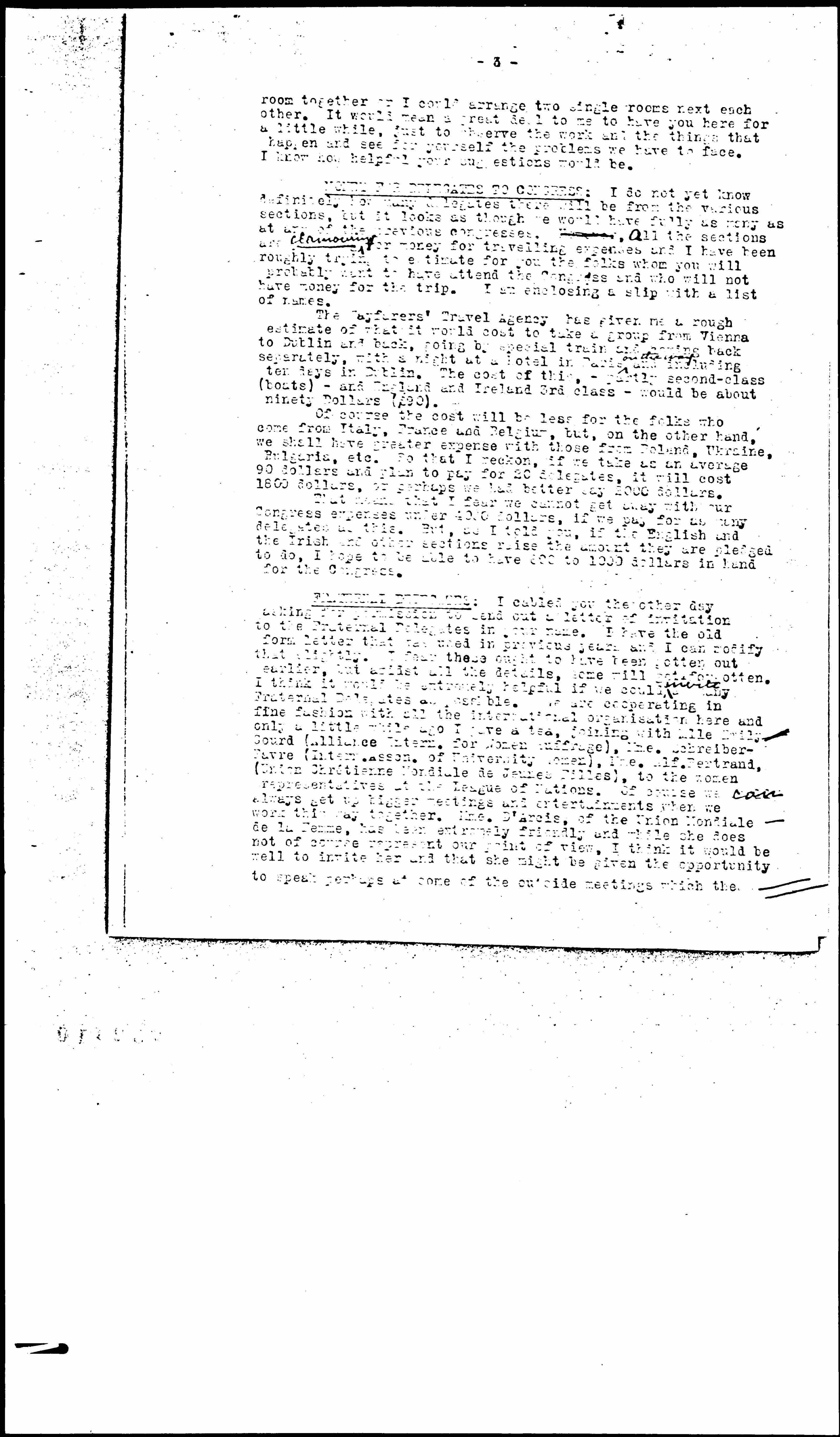 FRATERNAL DELEGATES: I cabled you the other day asking for permission to send out a letter of invitation to the Fraternal Delegates in your name. I have the old form letter that was used in previous years and I can modify that slightly. I fear these ought to have been gotten out earlier, but amidst all the details, some will get forgotten. I think it would be extremely helpful if we could ↑write↓ as many Fraternal Delegates as possible. We are cooperating in fine fashion with all the international [organization] here and only a little while ago I gave a tea, joining with Mlle Emily Gourd (Alliance Intern. for Women suffrage), Mme. Schreiber-Favre (Intern. Asscn. of University Women), Mme. Alf. Bertrand, (Union Chrétienne Mondiale de Jeunes Filles), to the women representatives at the League of Nations. Of course we ↑can↓ always get up bigger meetings and entertainments when we work this way together. Mme. D'Arcis, of the Union Mondiale de la Femme, has been extremely friendly and while she does not of course represent our point of view, I think it would be well to invite her and that she might be given the opportunity to speak perhaps at some of the outside meetings which the [page 4] Irish are anxious to have, not only in Dublin but also in some of the other cities. Or perhaps we could give the Fraternal Delegates a chance to speak for a few minutes at one of the evening sessions. However, you will know best about this.