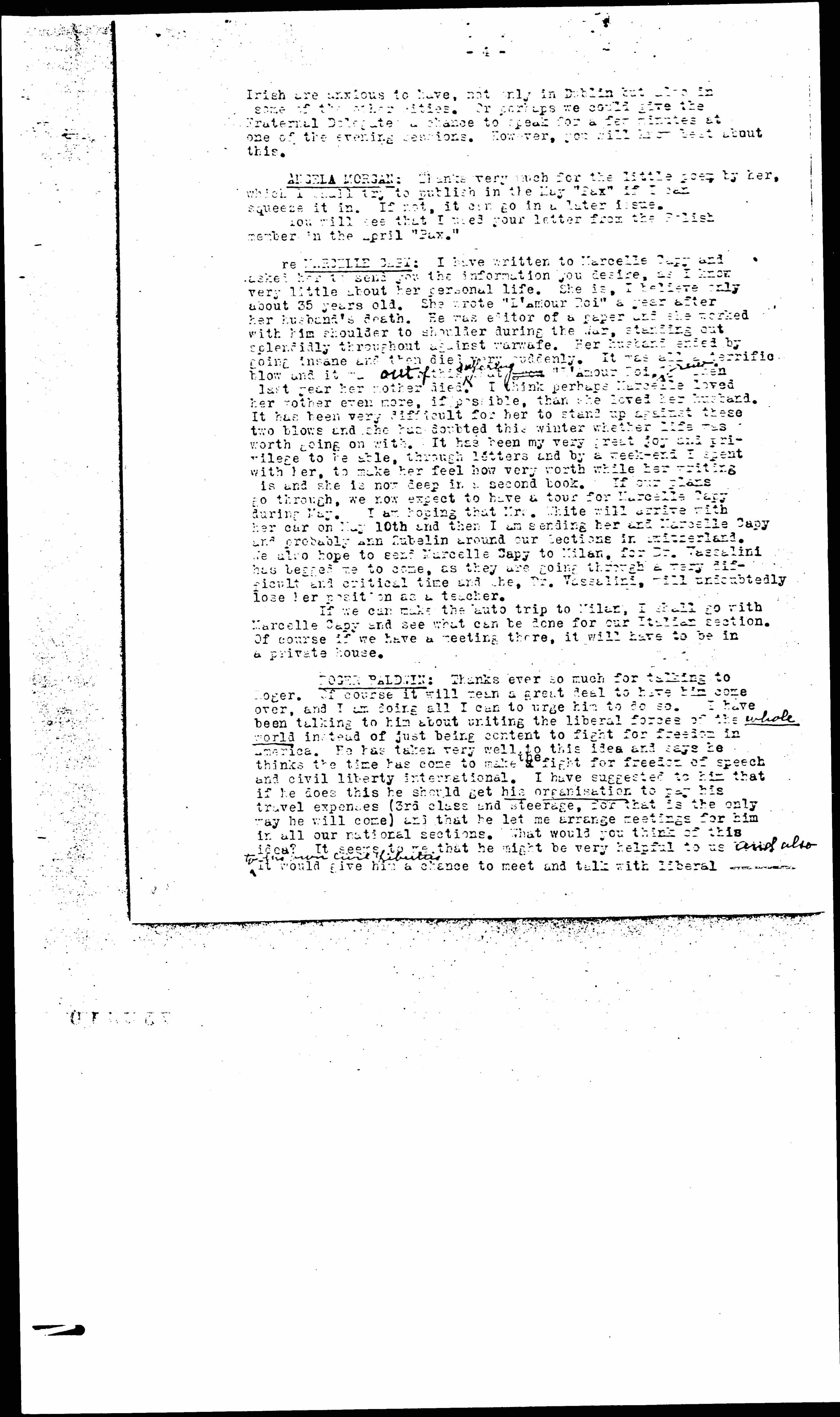 re MARCELLE CAPY: I have written to Marcelle Capy and asked her to send you the information you desire, as I know very little about her personal life. She is, I believe only about 35 years old. She wrote "L'Amour Roi" a year after her husband's death. He was editor of a paper and she worked with him shoulder to shoulder during the War, standing out splendidly throughout against [warfare]. Her husband ended by going insane and then died very suddenly. It was all a terrific blow and it was ↑out of↓ this ↑suffering↓ that grew "L'Amour Roi" ↑grew↓ when last year her mother died. I think perhaps Marcelle loved her mother even more, if possible, than she loved her husband. It has been very difficult for her to stand up against these two blows and she has doubted this winter whether life was worth going on with. It has been my very great joy and privilege to be able, through letters and by a [weekend] I spent with her, to make her feel how very [worthwhile] her writing is and she is now deep in a second book. If our plans go through, we now expect to have a tour for Marcelle Capy during May. I am hoping that Mrs. White will arrive with her car on May 10th and then I am sending her and Marcelle Capy and probably Ann Zubelin around our Sections in Switzerland. We also hope to send Marcelle Capy to Milan, for Dr. Vassalini has begged me to come, as they are going through a very difficult and critical time and she, Dr. Vassalini, will undoubtedly lose her position as a teacher.