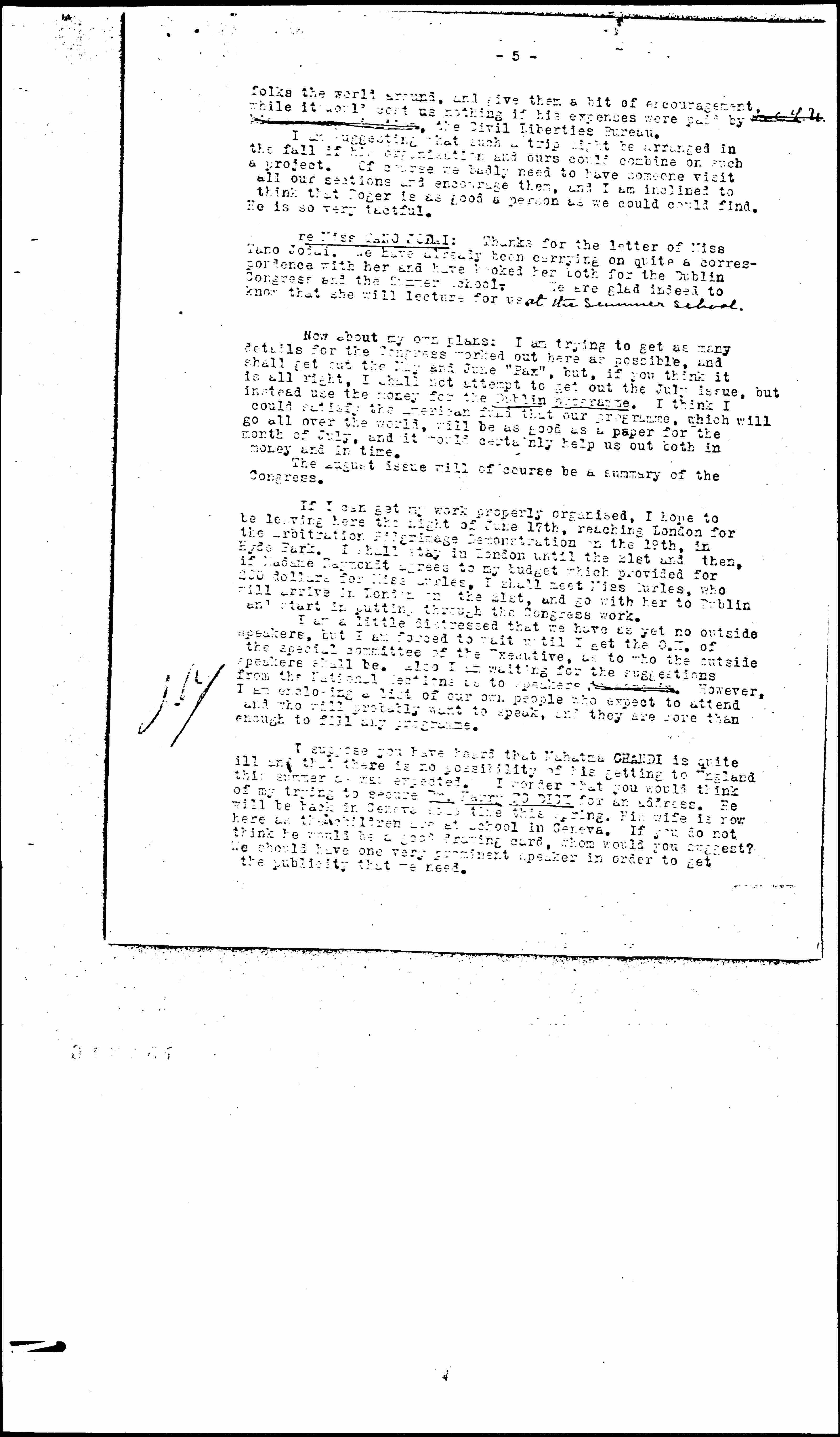 ROGER BALDWIN: Thanks ever so much for talking to Roger. Of course it will mean a great deal to have him come over, and I am doing all I can to urge him to do so. I have been talking to him about uniting the liberal forces of the ↑whole↓ world instead of just being content to fight for freedom in America. He has taken very well to this idea and says he thinks the time has come to makea ↑the↓ fight for freedom of speech and civil liberty international. I have suggested to him that if he does this he should get his [organization] to pay his travel expenses (3rd class and steerage, for that is the only way he will come) and that he let me arrange meetings for him in all our national sections. What would you think of this idea? It seems to me that he might be very helpful to us [and also to his own civil liberties]. It would give him a chance to meet and talk with liberal [page 5] folks the world around, and give them a bit of encouragement, while it would cost us nothing if his expenses were paid by [illegible,] the Civil Liberties Bureau.
