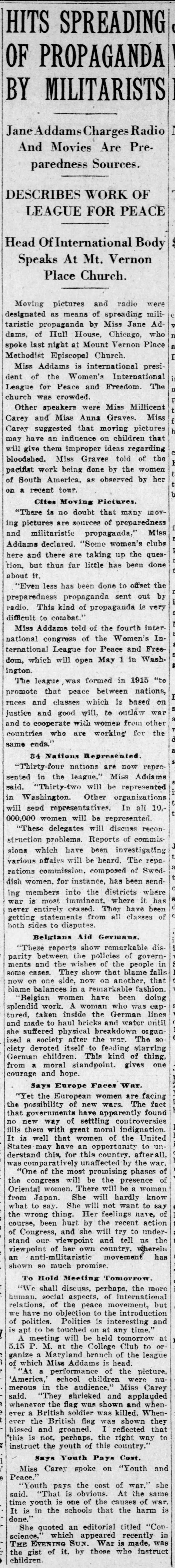 Jane Addams Charges Radio And Movies Are Preparedness Sources.