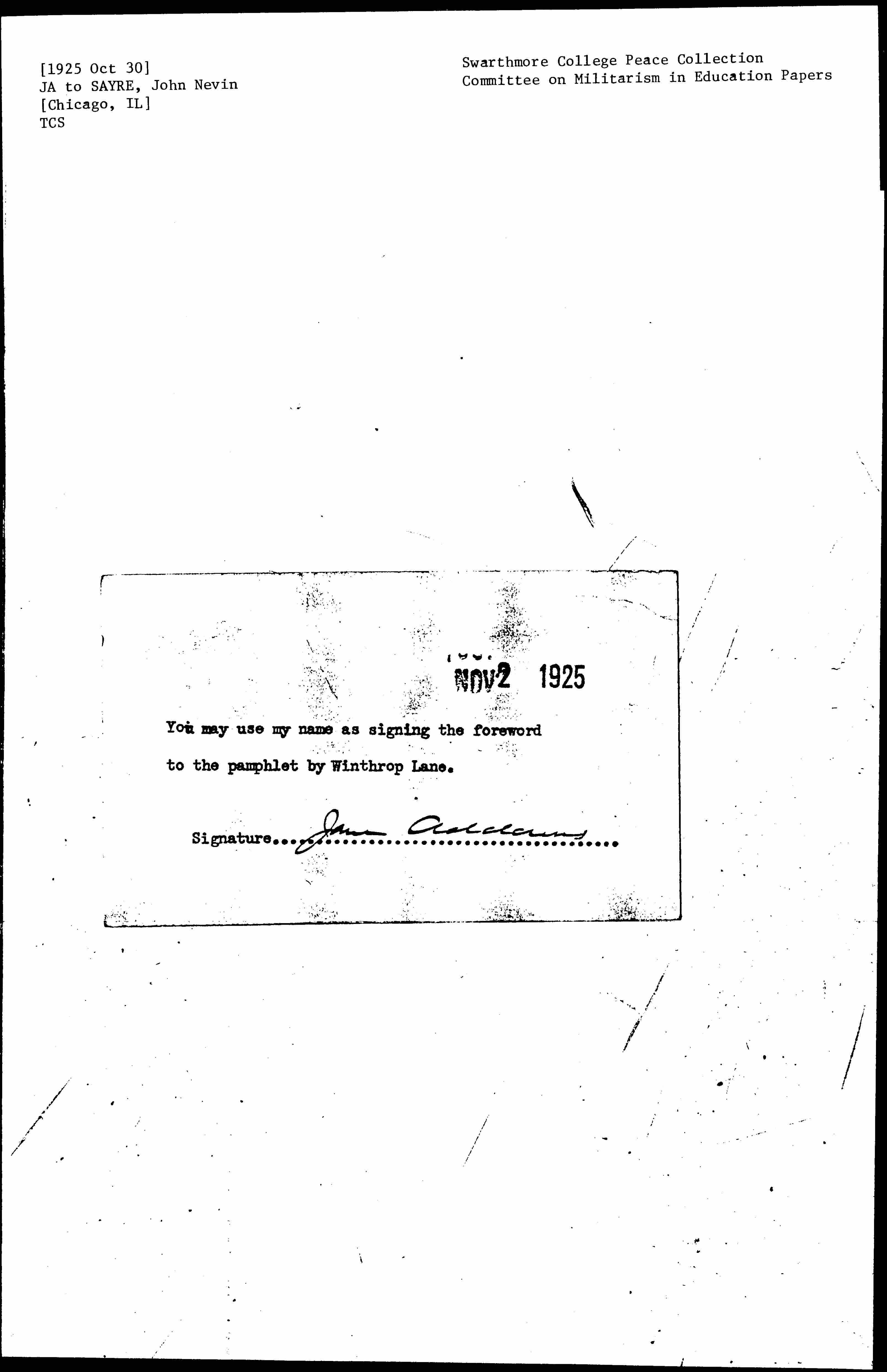You may use my name as signing the foreword to the pamphlet by Winthrop Lane.