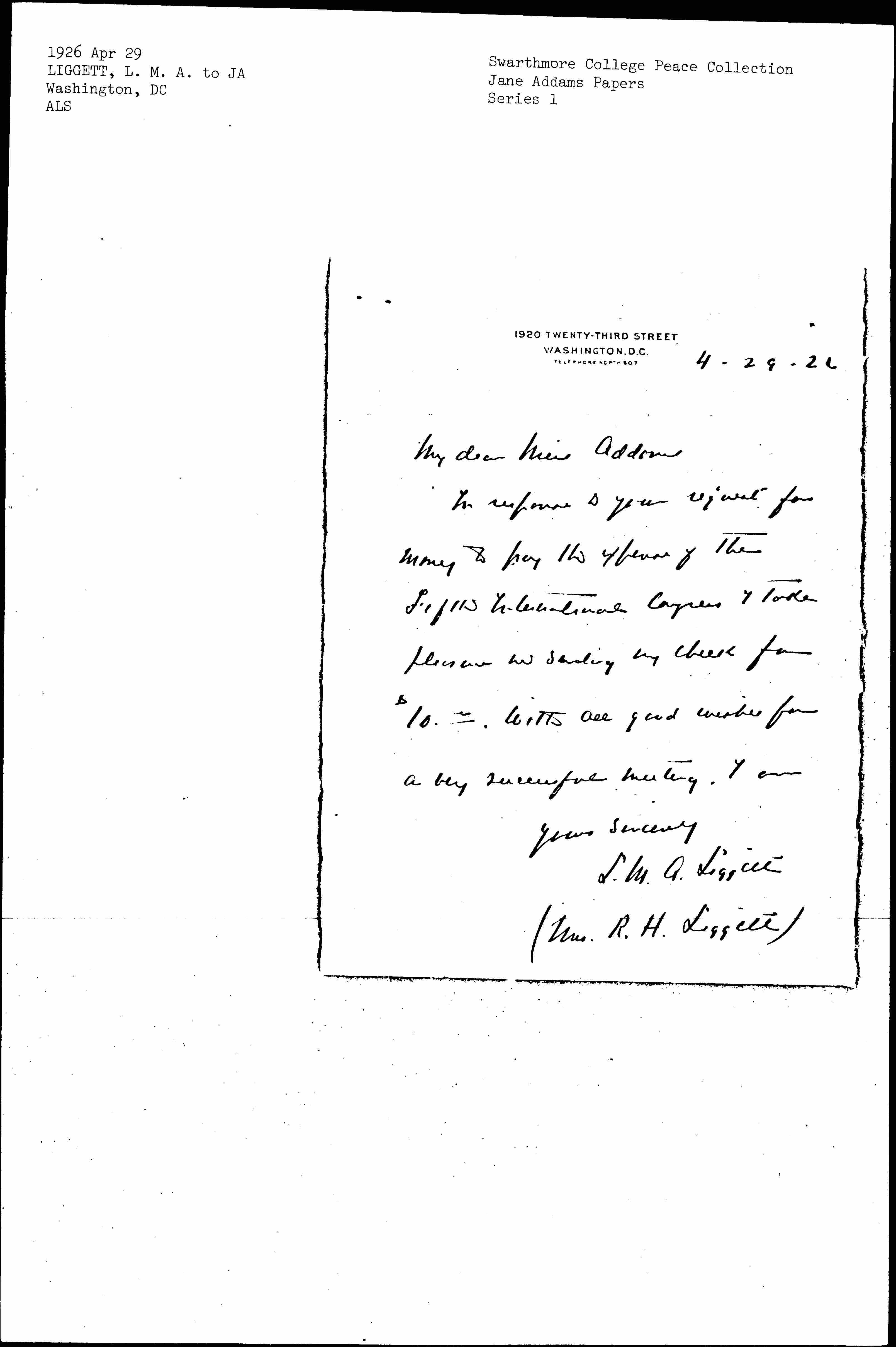 In response to your request for money to pay the expense of the Fifth International Congress I take pleasure in sending my check for $10.00. With all good wishes for a very successful meeting. I am