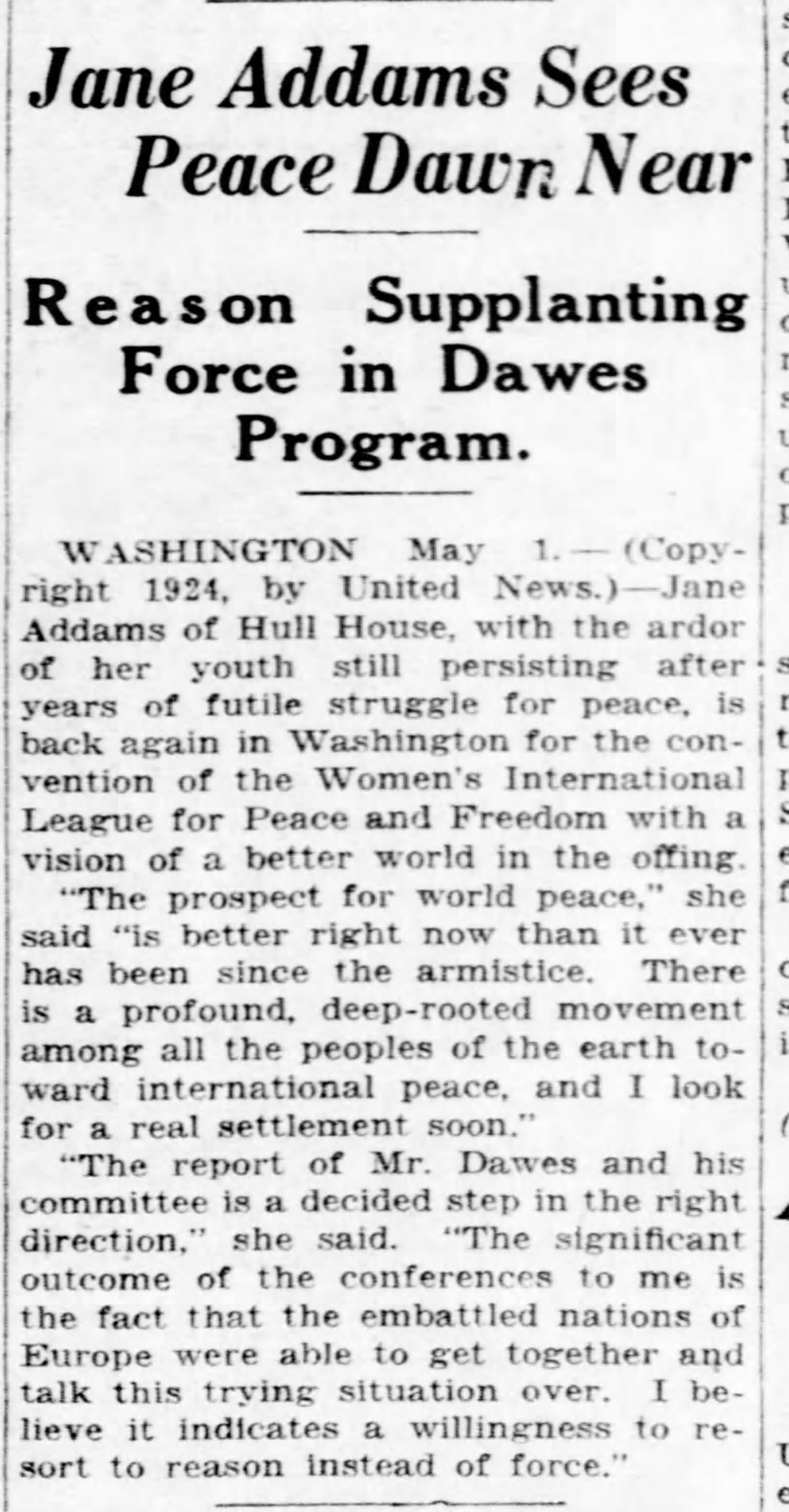 "The report of Mr. Dawes and his committee is a decided step in the right direction," she said. "The significant outcome of the conferences to me is the fact that the embattled nations of Europe were able to get together and talk this trying situation over. I believe it indicates a willingness to resort to reason instead of force."