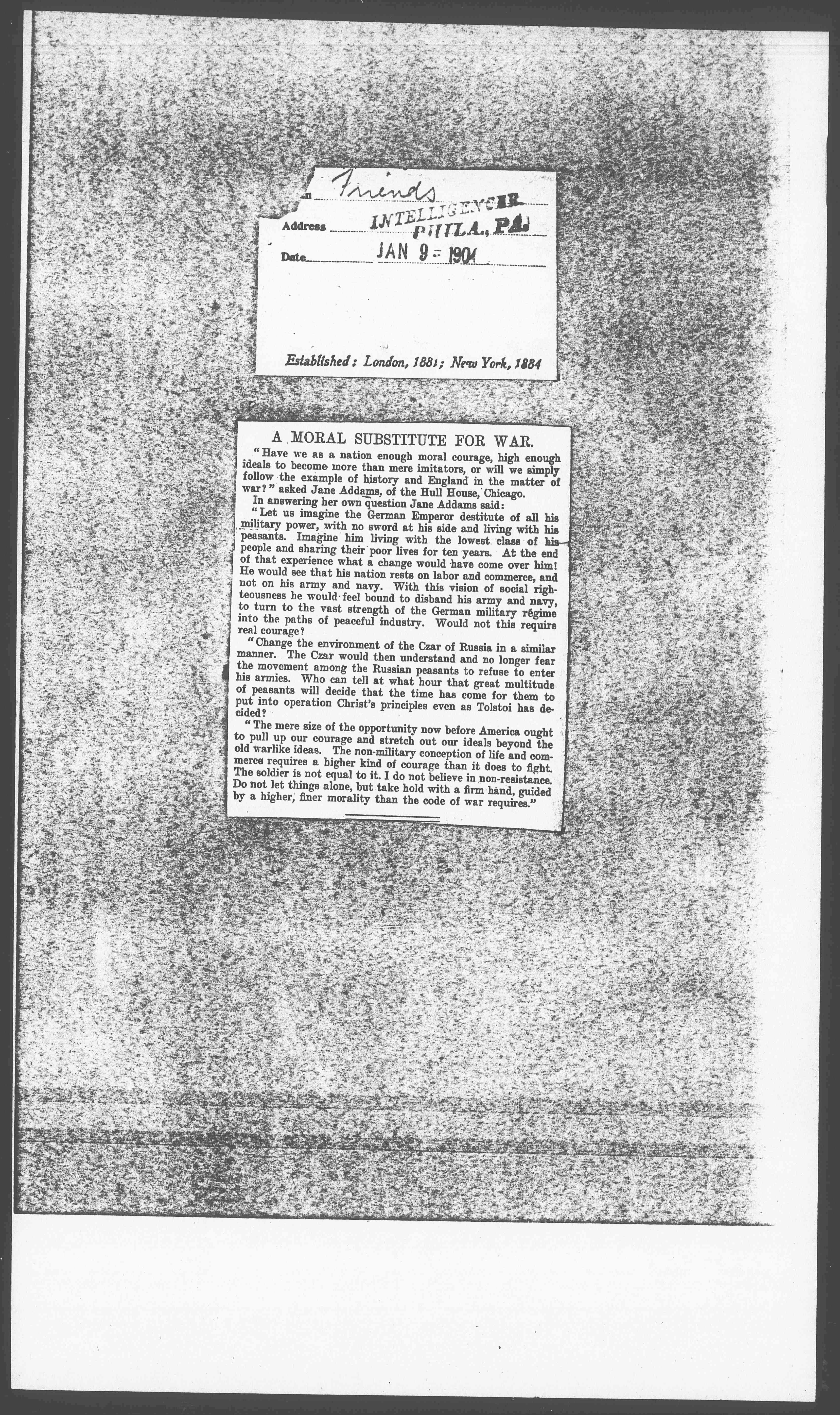 "Have we as a nation enough moral courage, high enough ideals to become more than mere imitators, or will we simply follow the example of history and England in the matter of war?" asked Jane Addams of the Hull House, Chicago.